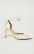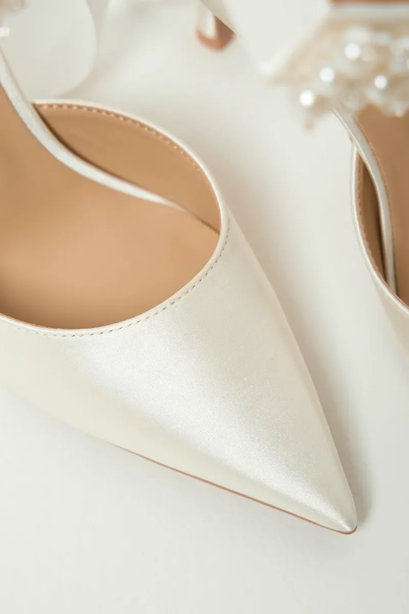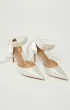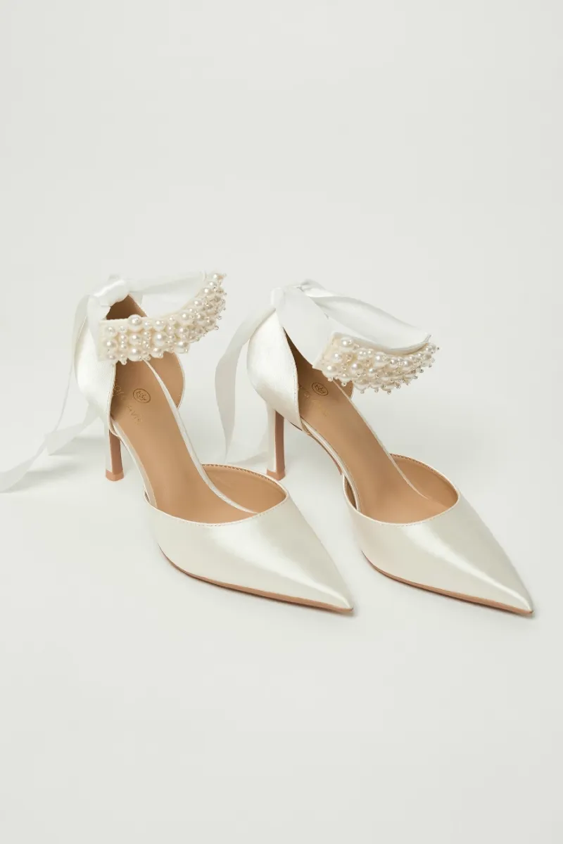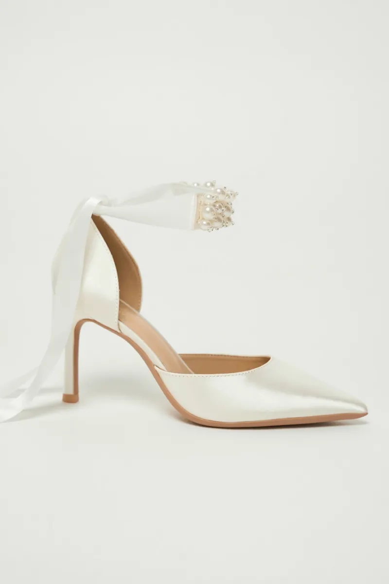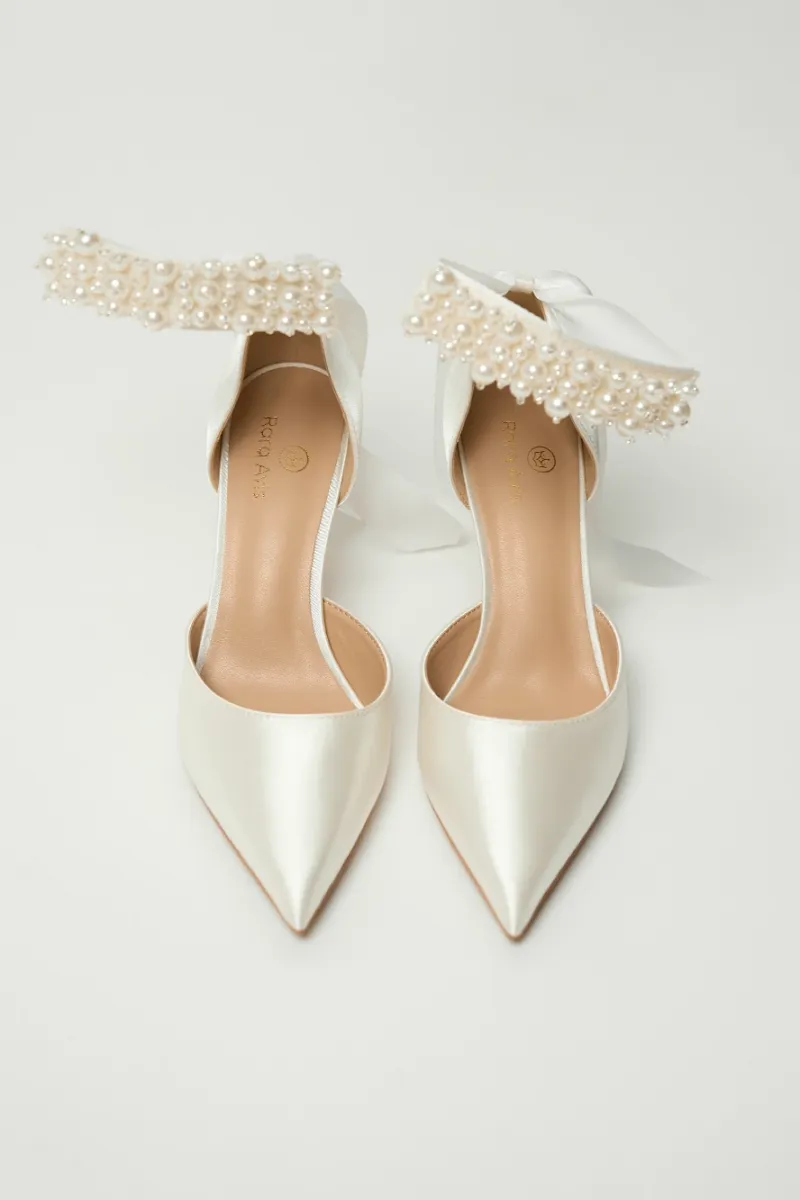 Туфли-лодочки из белоснежного сатина, на шпильке, с острым носом и закрытой пяткой. Изюминка модели — тонкие ремешки вокруг щиколотки, украшенные жемчужинами и бисером , с атласными лентами для завязки.