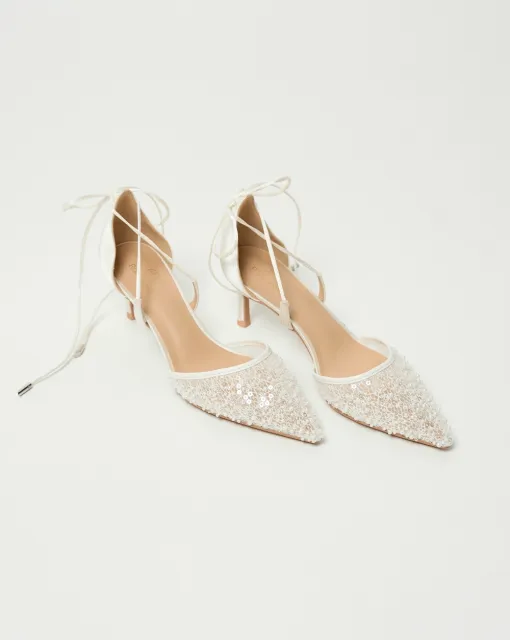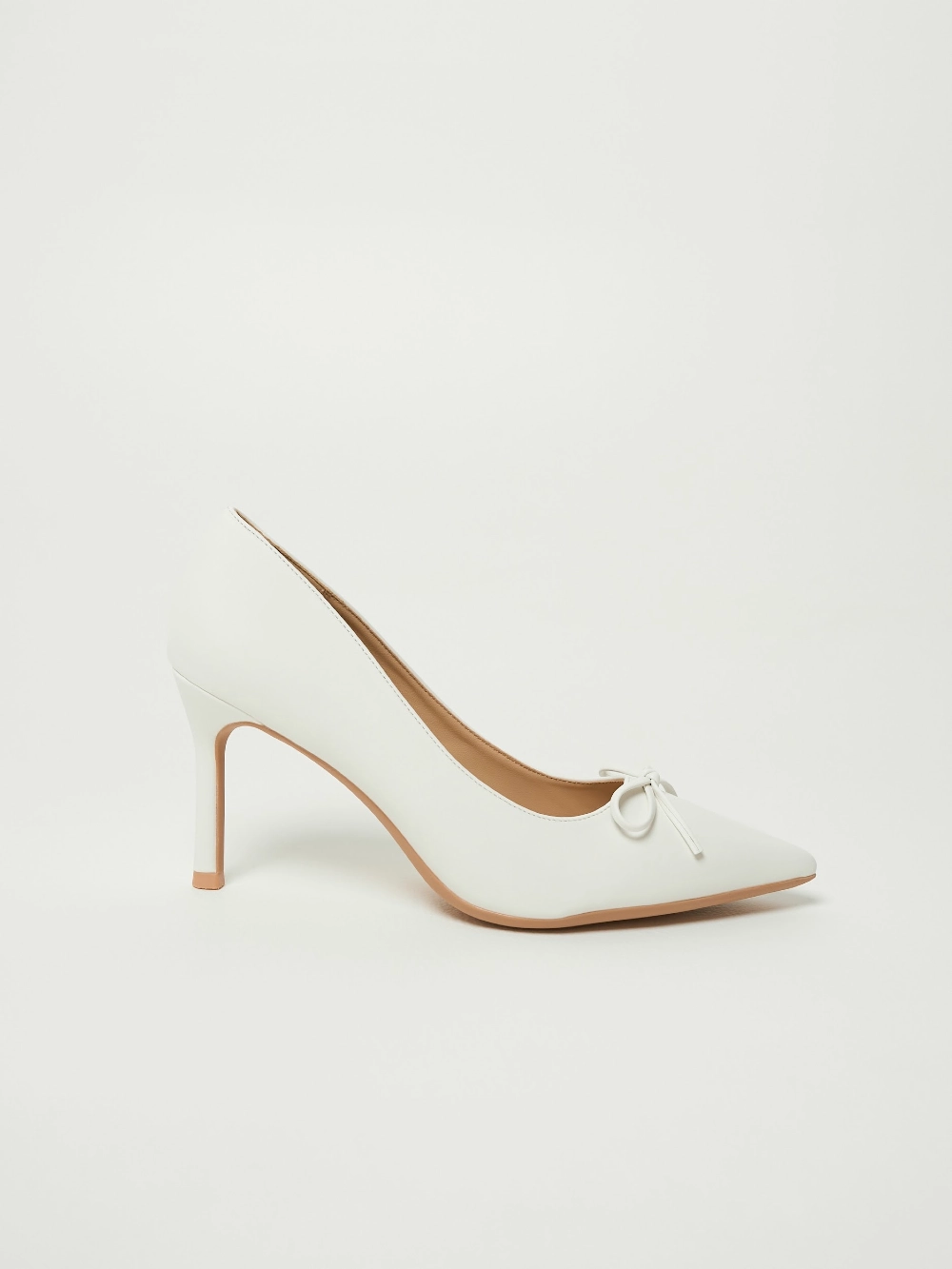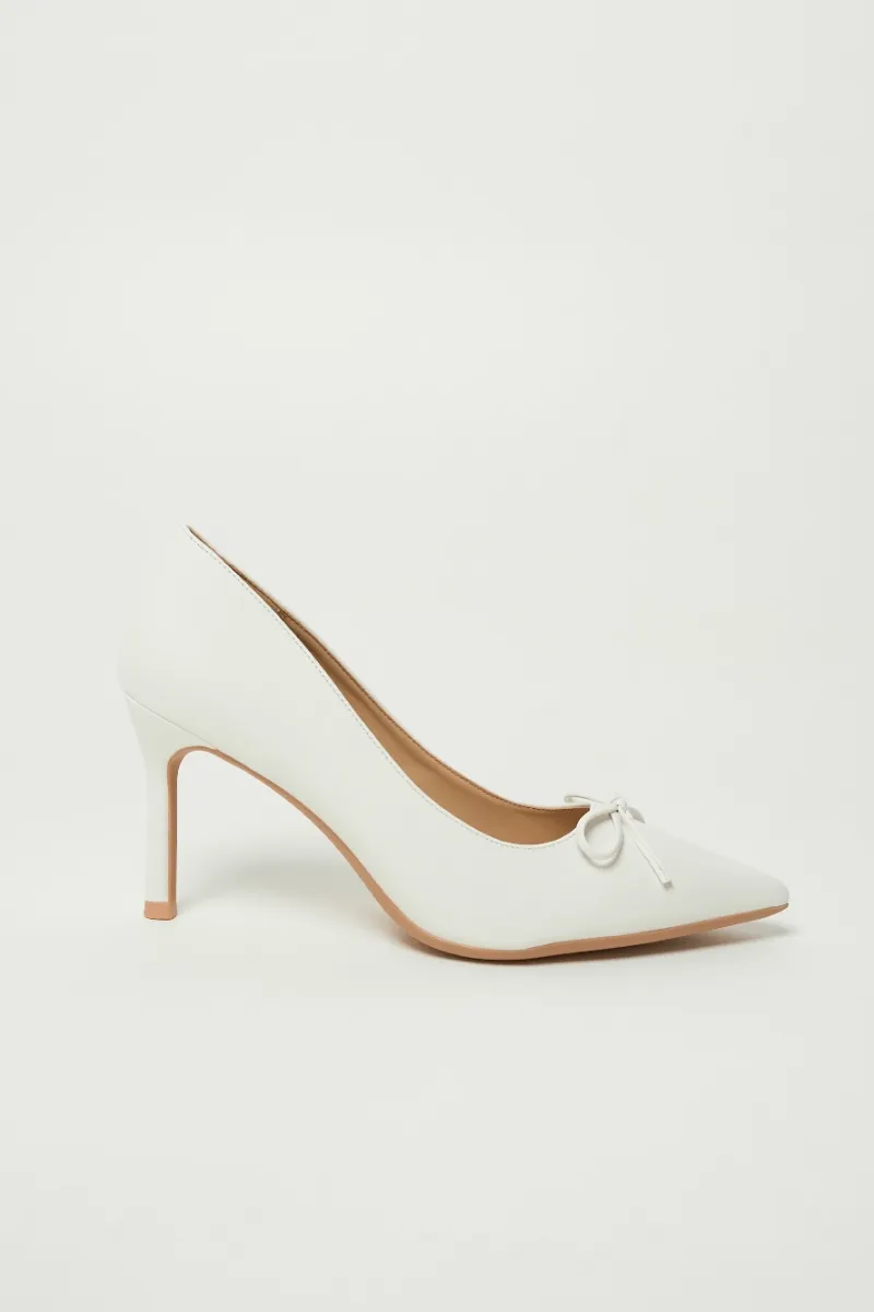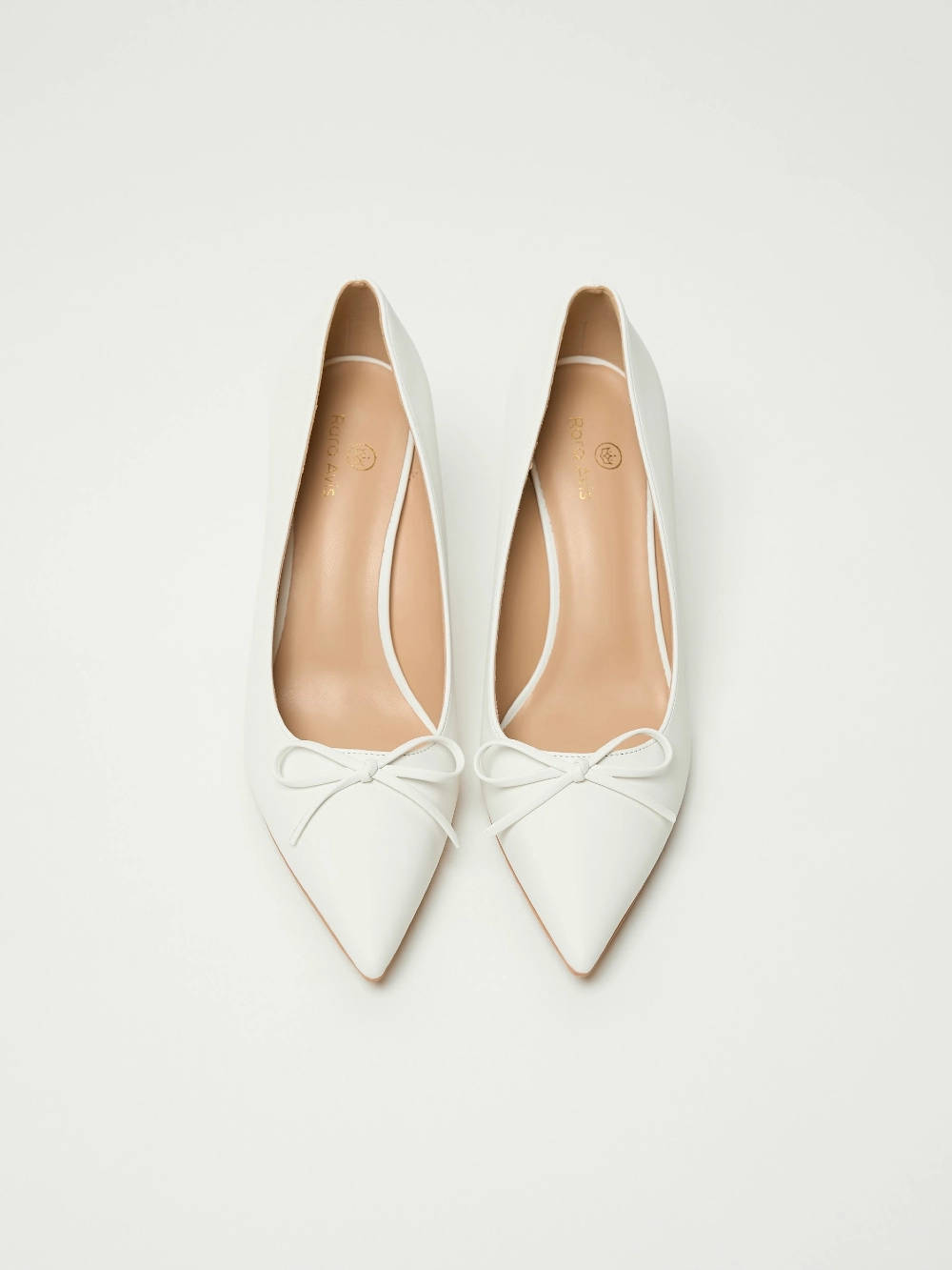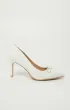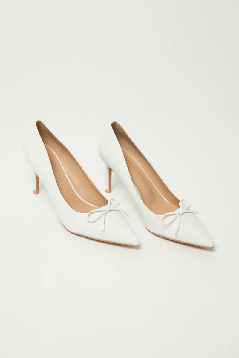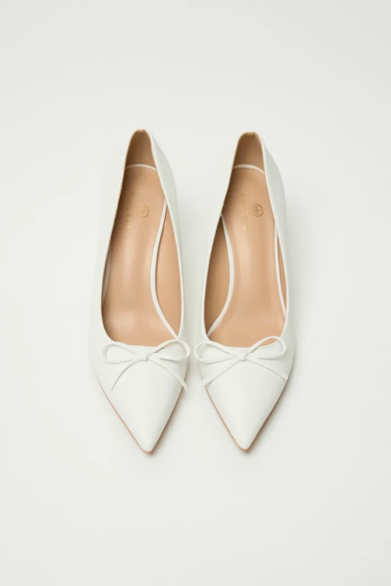 Сатиновые молочные туфли-лодочки на шпильке, с заострённым мысом и аккуратным бантом.