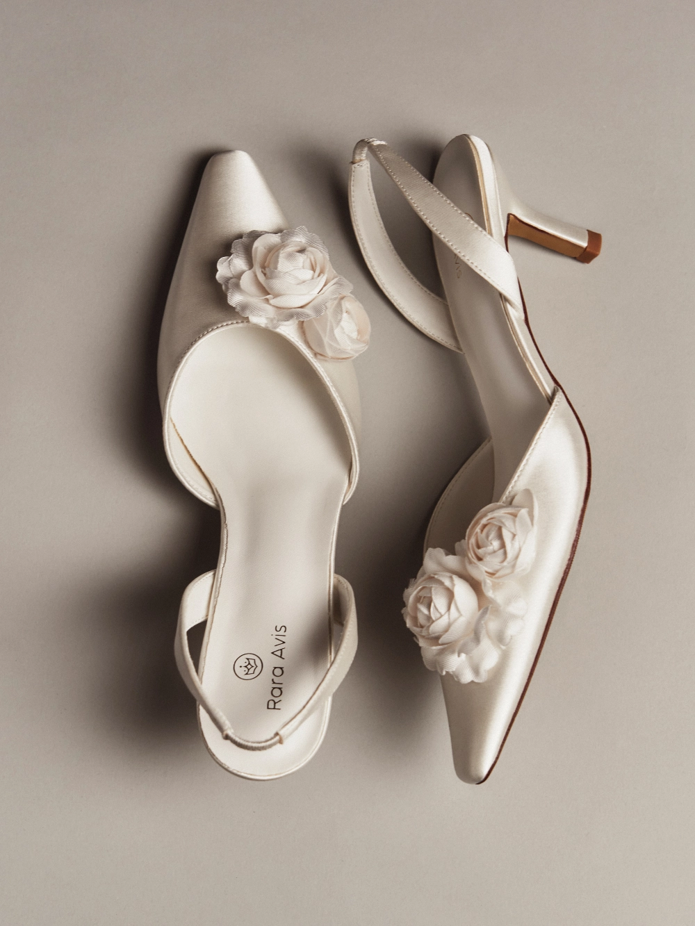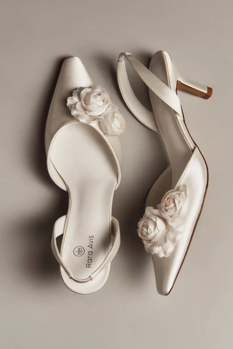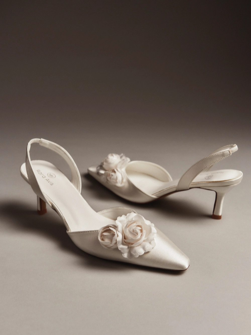 Изысканные молочно-сатиновые слингбэки со скругленным носом и цветочной аппликацией. Лёгкая шпилька и открытая пятка создают утончённый, романтичный образ для особых случаев.