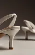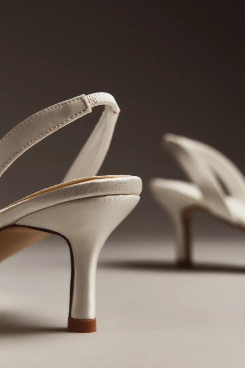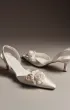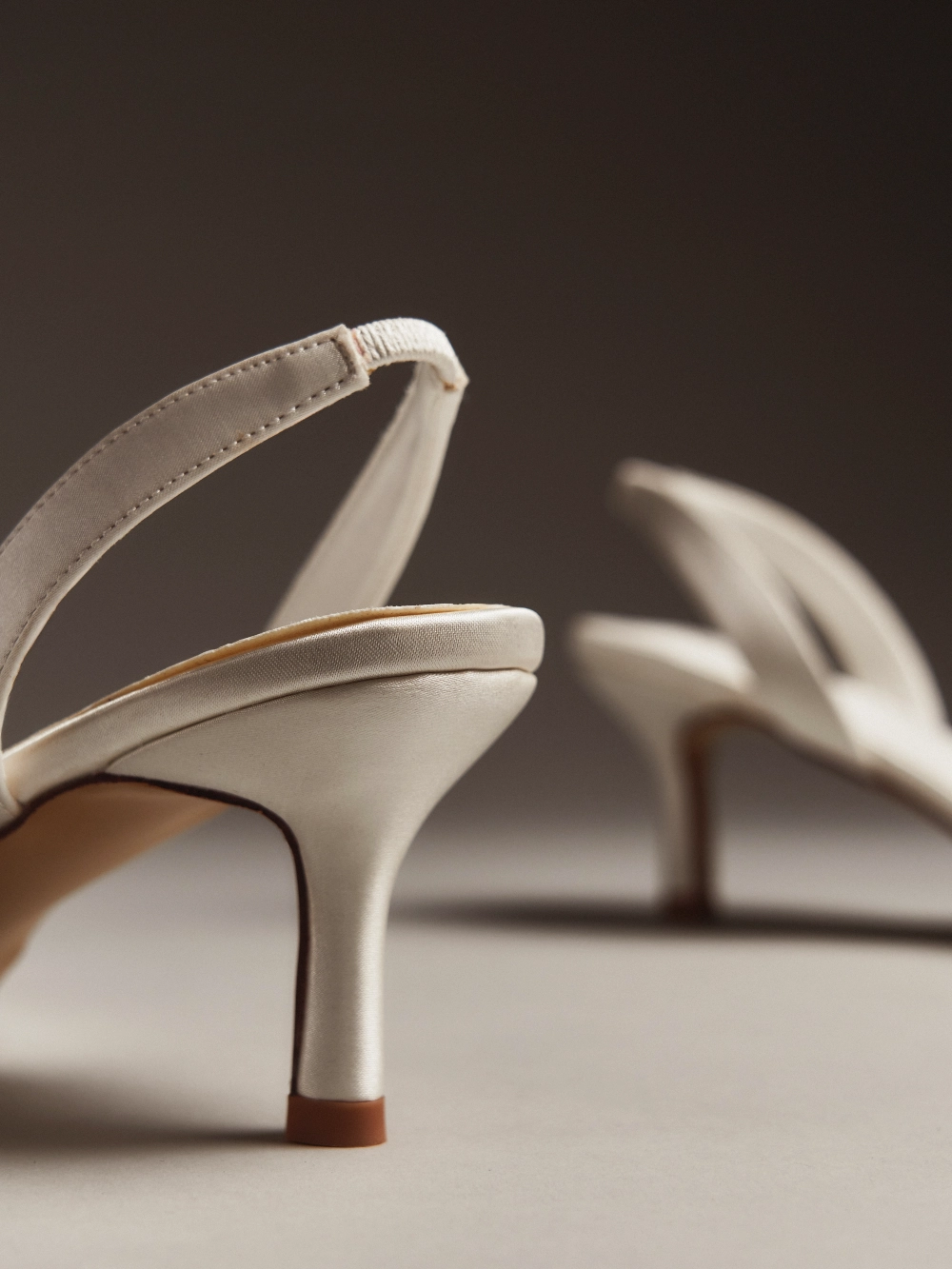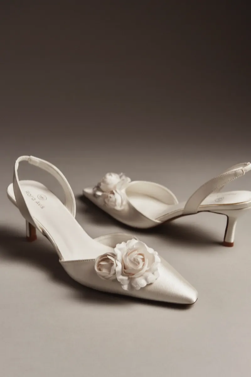 Изысканные молочно-сатиновые слингбэки со скругленным носом и цветочной аппликацией. Лёгкая шпилька и открытая пятка создают утончённый, романтичный образ для особых случаев.