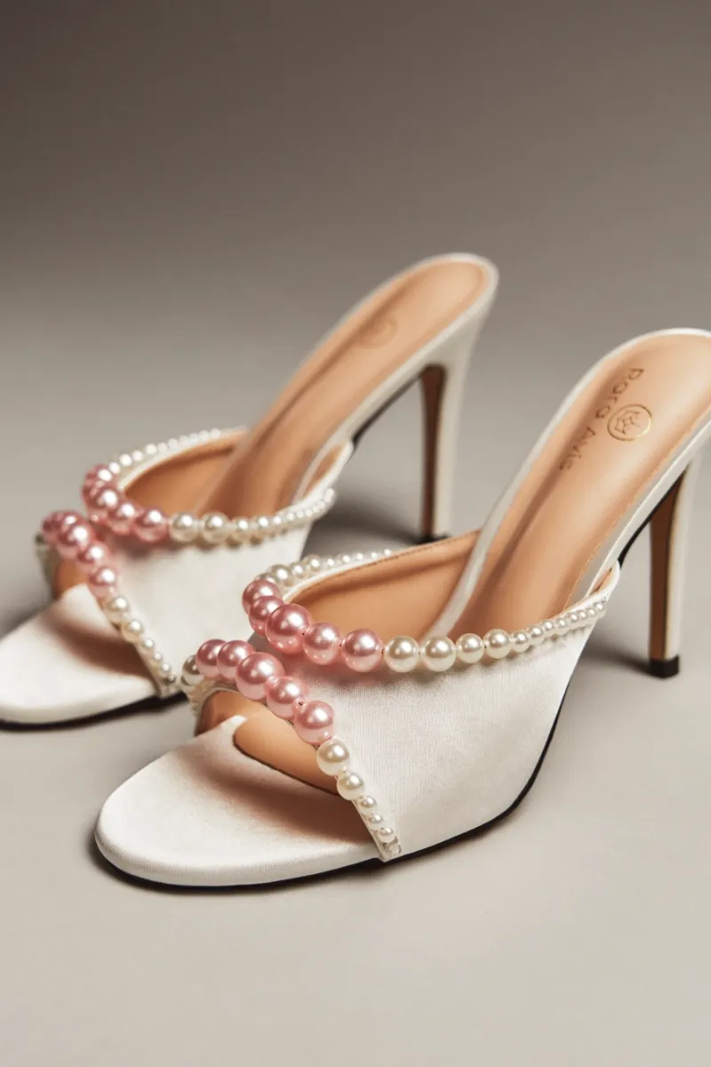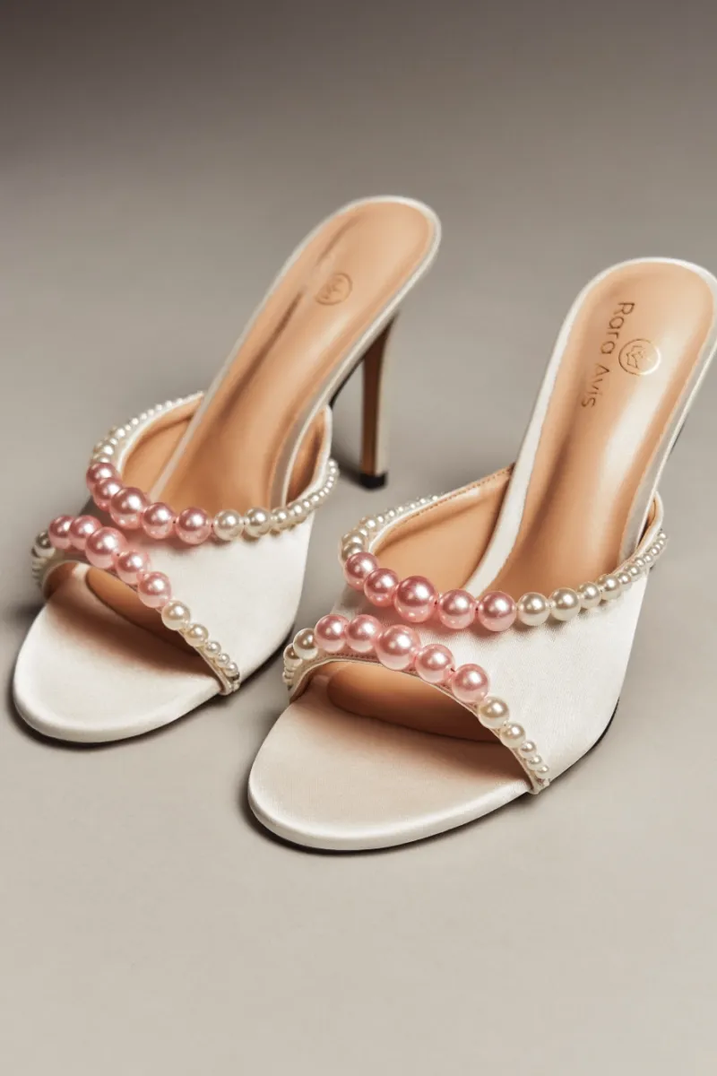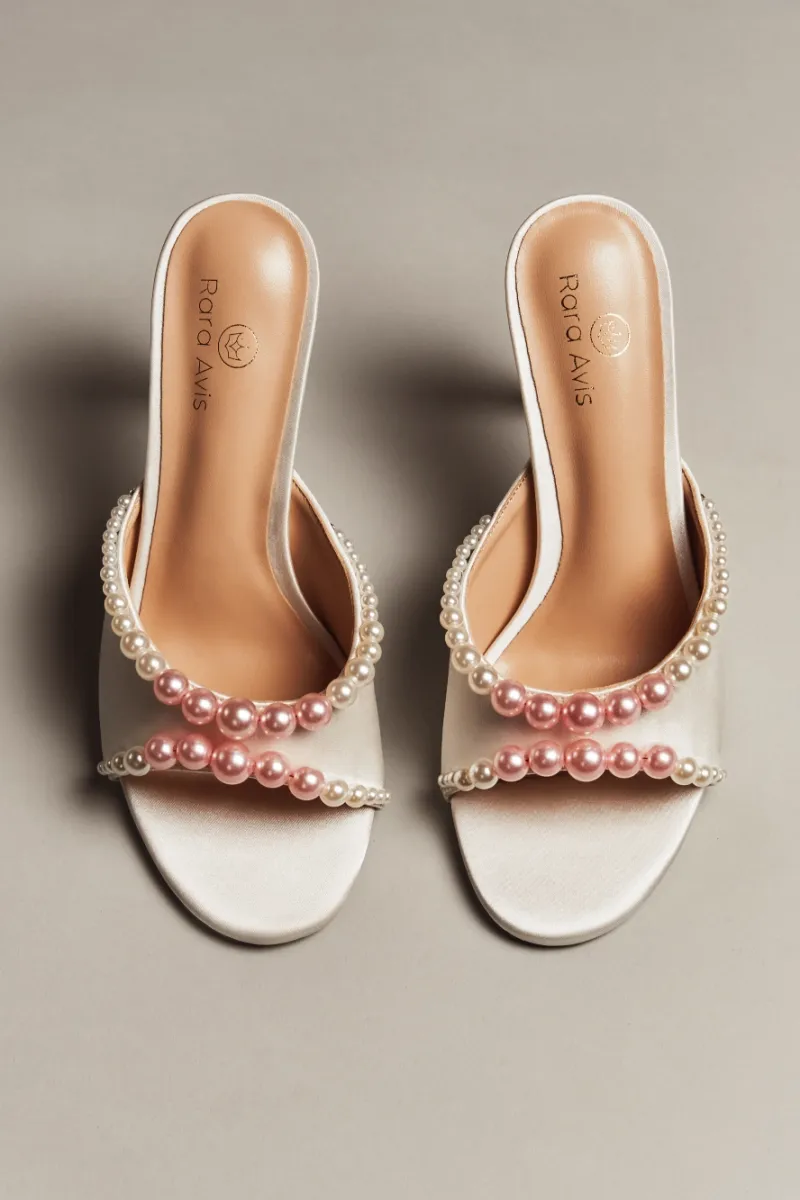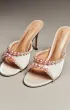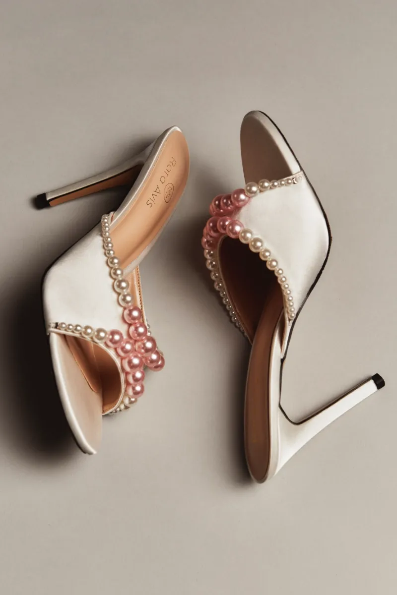Элегантные молочные мюли с открытым мысом, декорированные многослойной композицией из перламутровых жемчужин разного размера. Высокий каблук и подчёркнутая линия стопы создают утончённый и праздничный образ, идеальный для торжеств.
