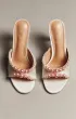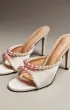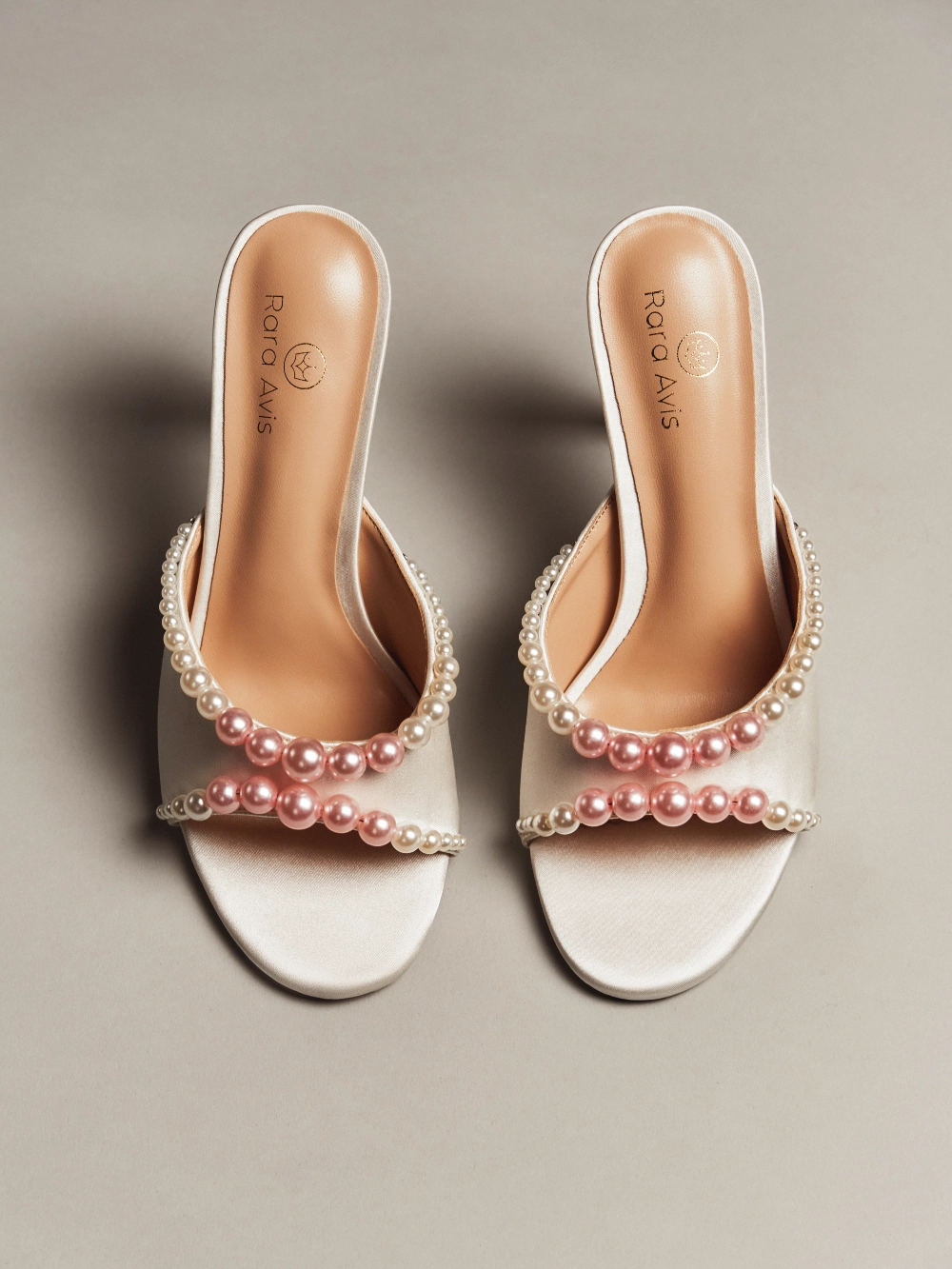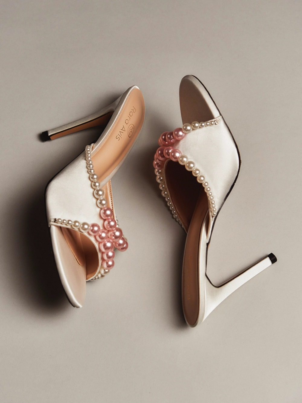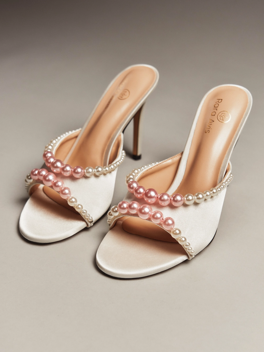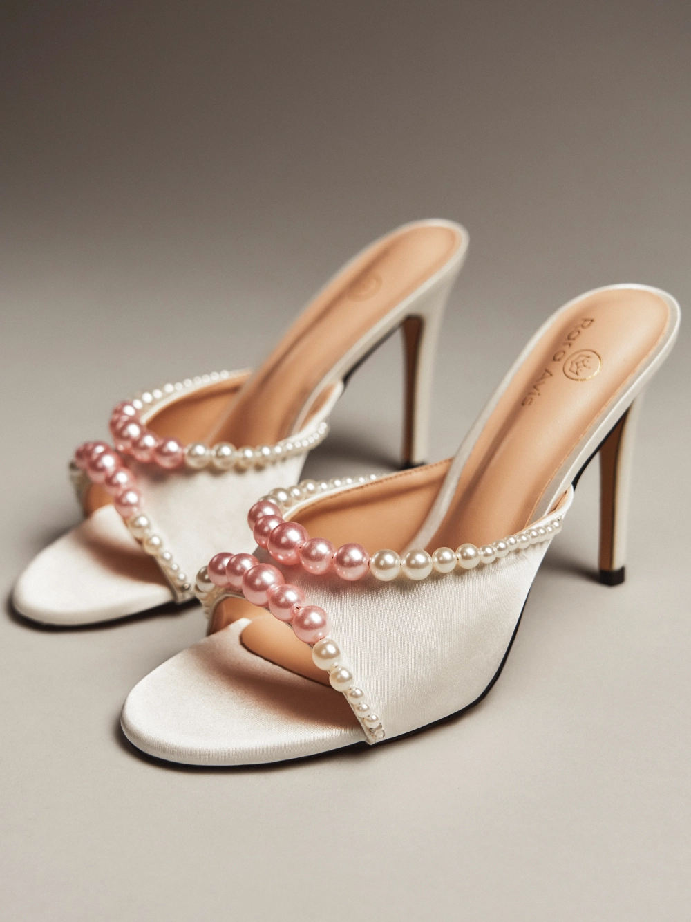 Элегантные молочные мюли с открытым мысом, декорированные многослойной композицией из перламутровых жемчужин разного размера. Высокий каблук и подчёркнутая линия стопы создают утончённый и праздничный образ, идеальный для торжеств.