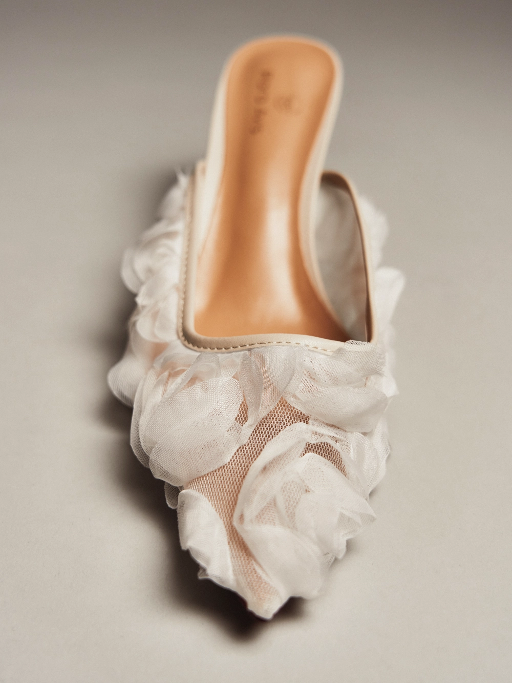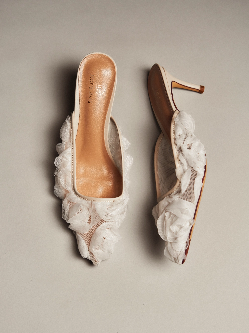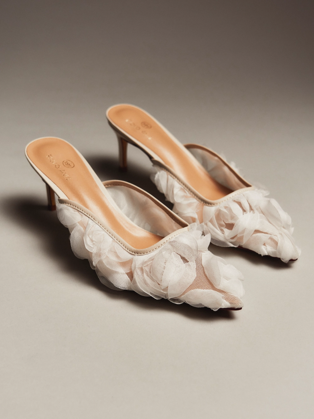 Минималистичные молочно-атласные мюли с открытым вытянутым мысом и тонкой шпилькой. Чистые линии, идеальная посадка и объемные цветы из шифона. делают эту пару универсальной для современной невесты и вечернего гардероба.
