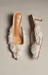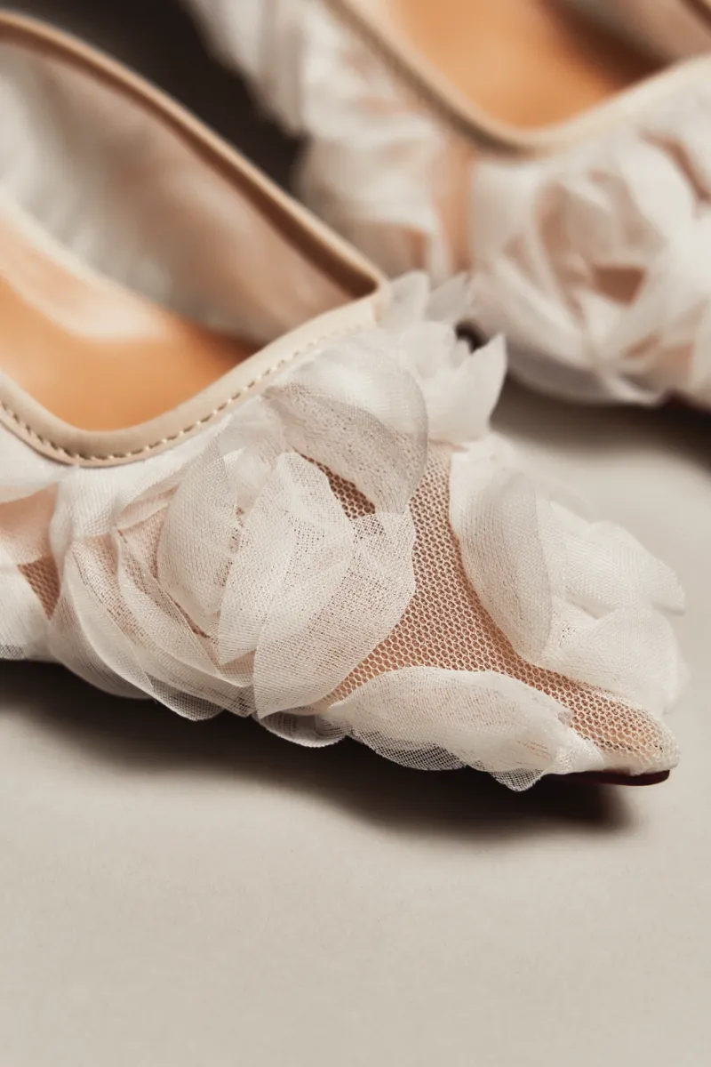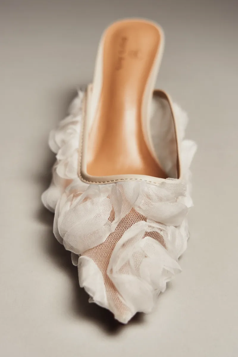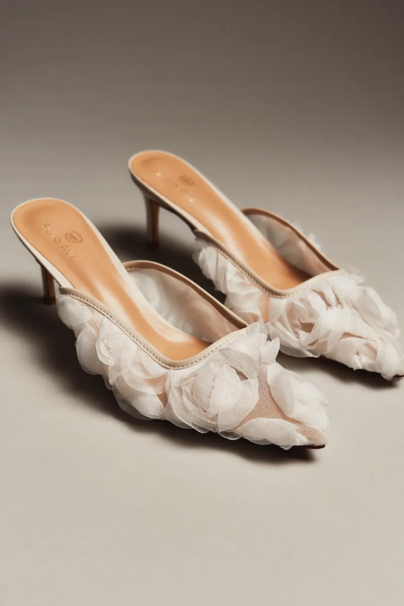 Минималистичные молочно-атласные мюли с открытым вытянутым мысом и тонкой шпилькой. Чистые линии, идеальная посадка и объемные цветы из шифона. делают эту пару универсальной для современной невесты и вечернего гардероба.