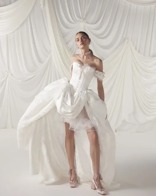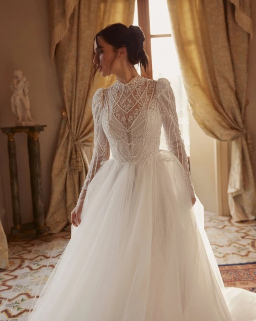 Свадебное платье А-силуэта с V-образным вырезом. Корсет платья украшен цветочным кружевом, нисходящим до юбки. Юбка многослойная с длинным шлейфом.