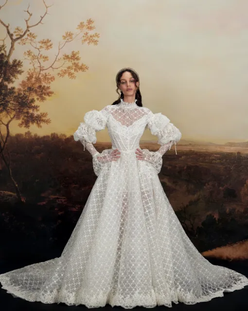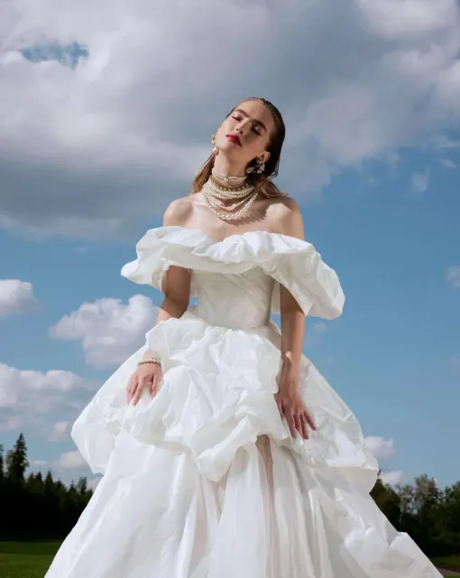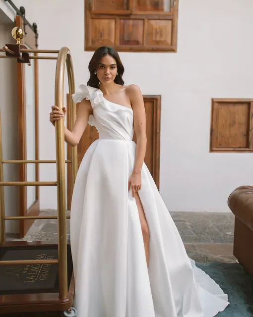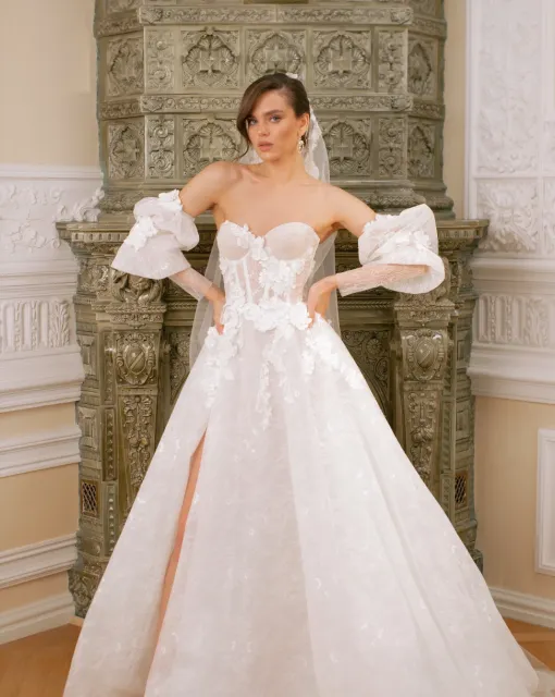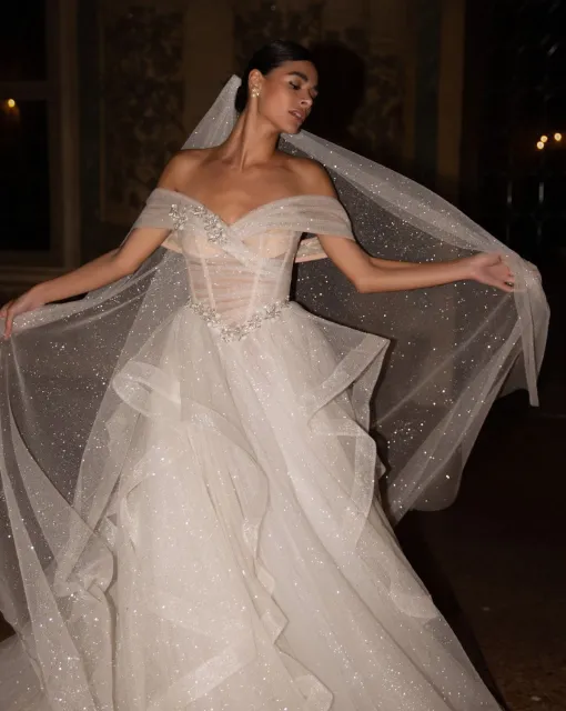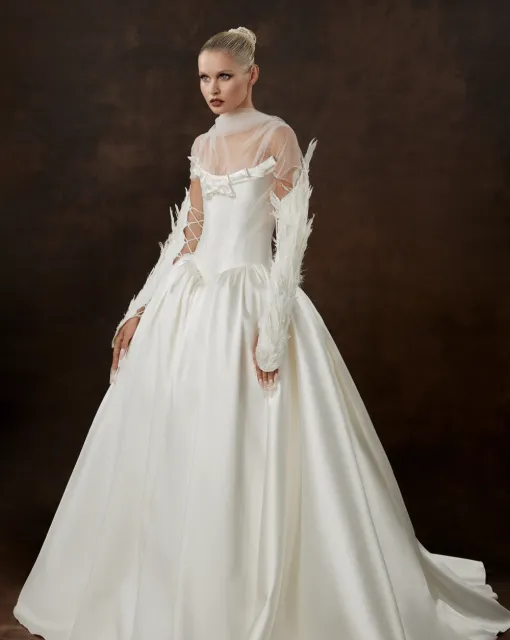 Свадебное платье А-силуэта с V-образным вырезом. Юбка многослойная, с длинным шлейфом. Верхний слой юбки состоит из 5 танкеток, которые полностью покрыты индивидуальными воланами и рюшами разной ширины.