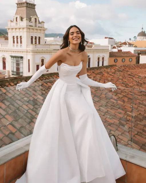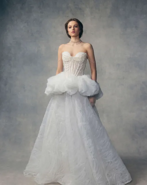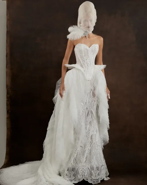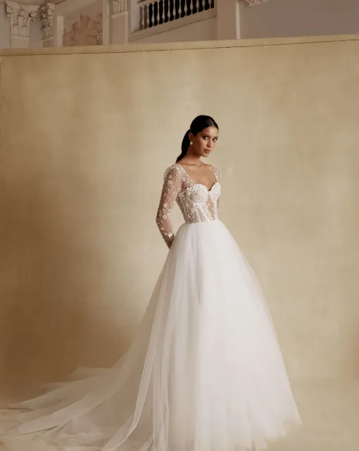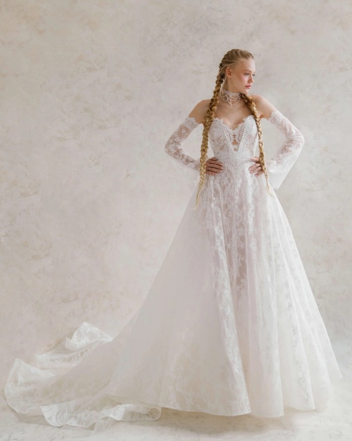 Струящееся свадебное платье А-силуэта с длинным шлейфом. Корсет V-образной формы расшит белым и жемчужным бисером. Рукава платья мягко ниспадают с плеч и добавляют образу воздушности.