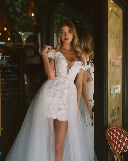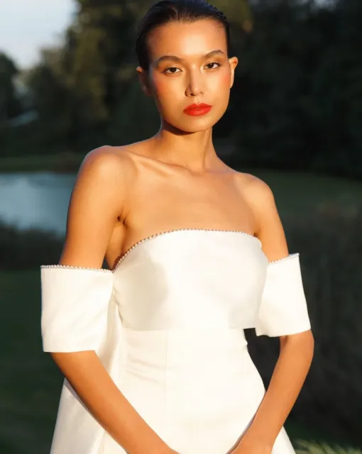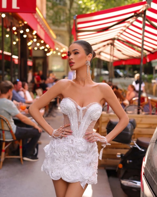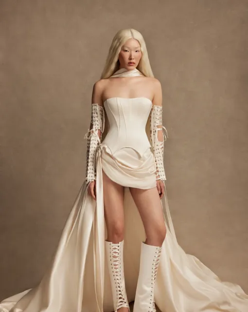 Блестящий свадебный комплект состоит из шелкового корсета, расшитого камнями, бисером и пайетками, и юбки из натурального шелка с длинным шлейфом