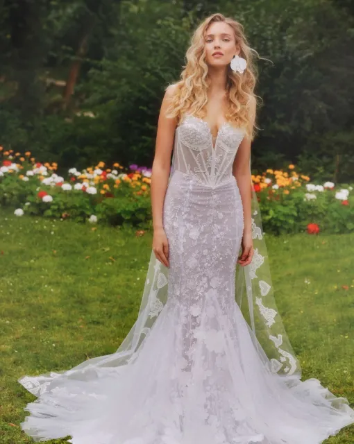 Нежное полупрозрачное свадебное платье, расшитое бисером, пайетками и украшенное объемными цветами ручной работы.
