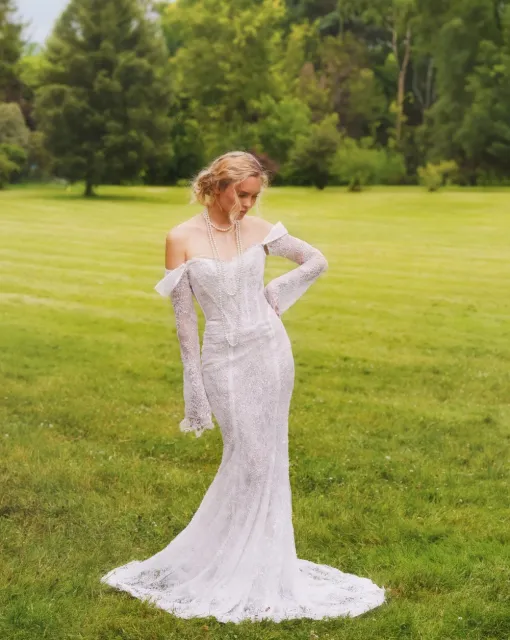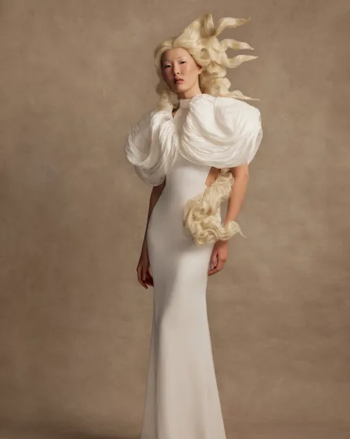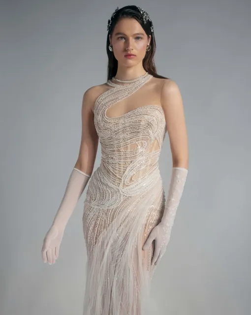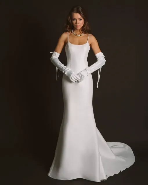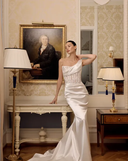 Платье силуэта «русалка» без рукавов с корсетом. Корсет имеет горизонтальные драпировки, которые изящно подчеркивают фигуру. Юбка-русалка имеет небольшой шлейф. Платье может быть выполнено в нескольких цветовых вариациях: гладкий молочный атлас и серебристый блесток.