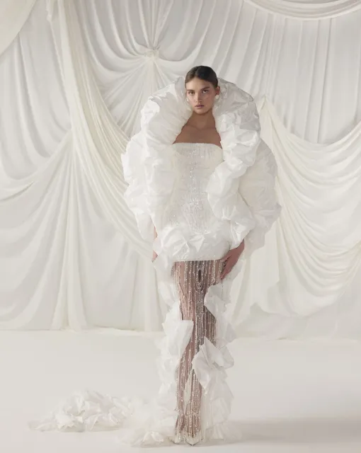 Эффектное свадебное платье со съемной пышной юбкой. Платье расшито пайетками. Юбка платья имеет длинный шлейф.