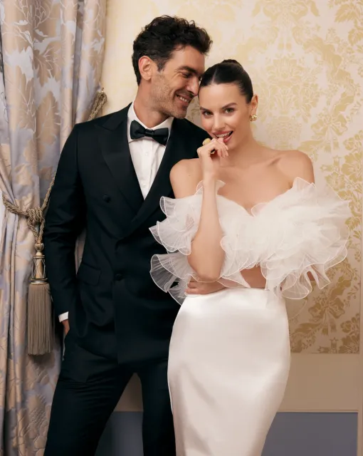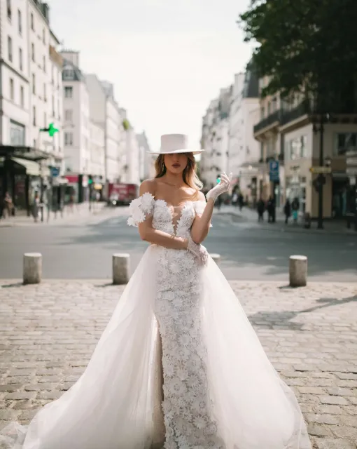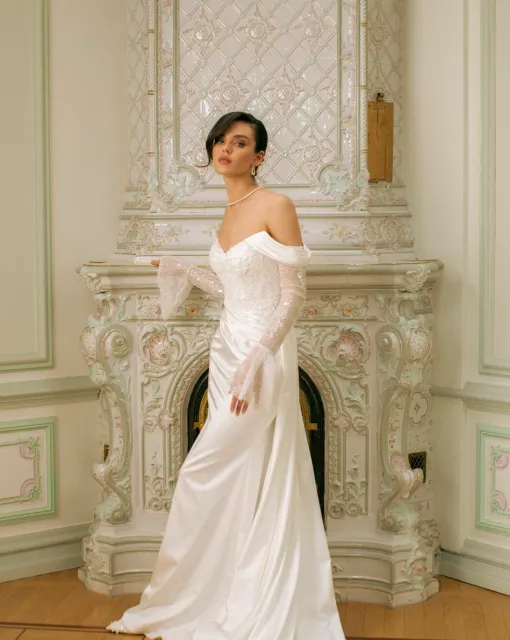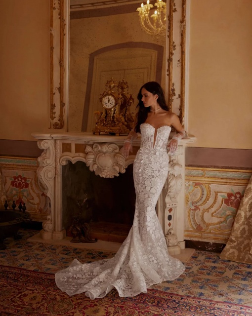 Свадебное платье силуэта «русалка». Цельное платье без корсета с отрезными мягкими чашками и тонкими декорированными бретелями. Нижняя часть платья дополнена воланами арочной формы.