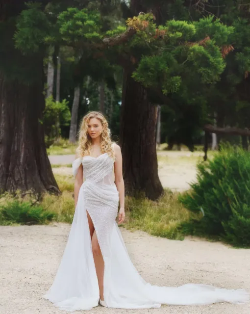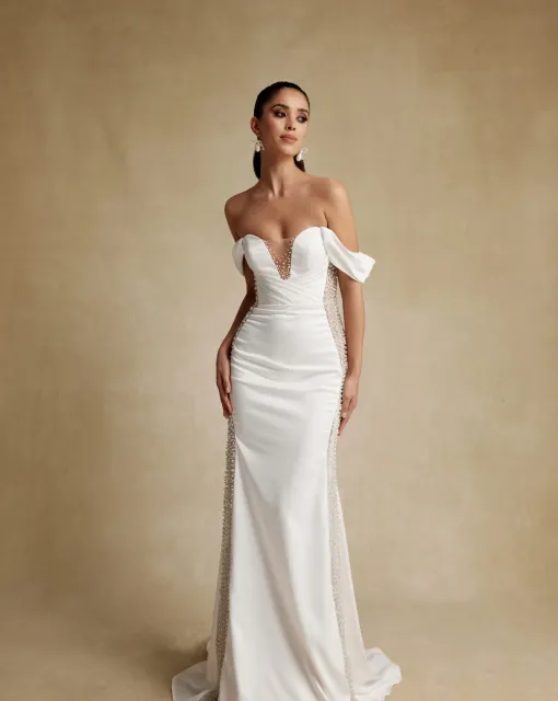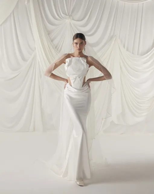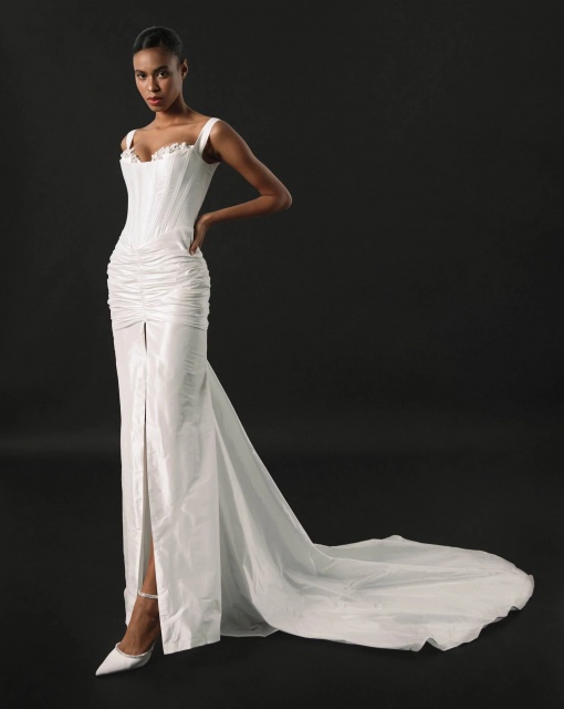 Свадебное платье приталенного силуэта. Лиф платья имеет глубокий V-образный вырез. Корсет декорирован кружевом с добавлением объемных цветов. Силуэтная юбка выполнена из матового атласа. Акцентом в платье является боковая вставка из телесного нейлона и расшитого кружева. Платье может быть дополнено кружевным болеро со шлейфом, который выполнен из сетки и декорирован кружевными элементами и объемными цветами.