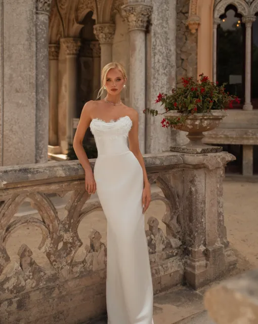 Цветочный свадебный комплект состоит из платья-русалки, съемной рубашки с рукавами и съемной юбки. Благодаря этим элементам невеста может менять свой образ во время торжества. Платье покрыто цветами. Свадебный образ может быть в молочном цвете.