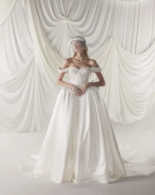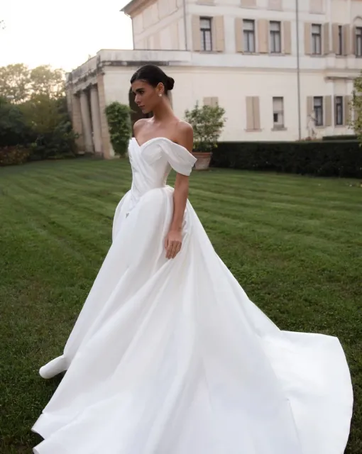 Платье приталенного силуэта.Корсет со съемной чашкой, рельефами и имитацией прозрачных тоннелей.Верхний край чашки украшен объемными цветами ручной работы.Талия подчеркнута атласным поясом. Бретельки из органзы придают образу легкости. Юбка многослойная, А-силуэта, со шлейфом.