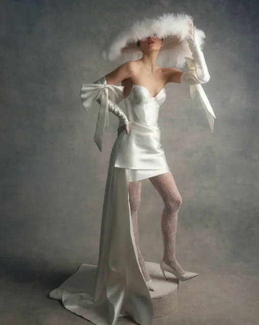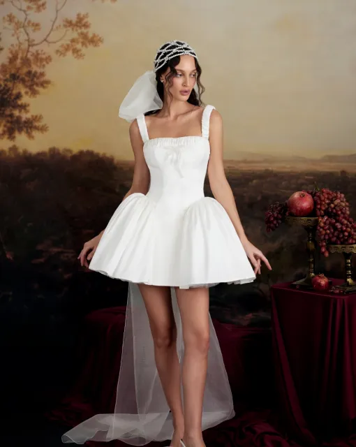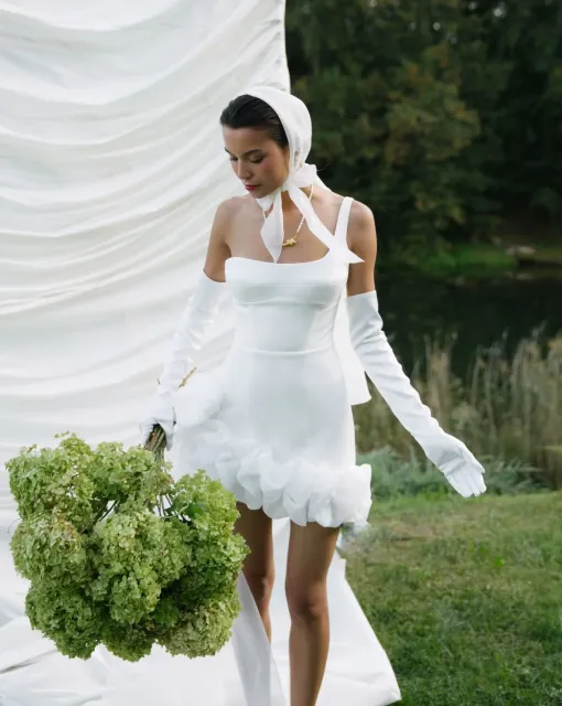 Великолепное свадебное платье цвета розовый металлик выполнено из новой ткани с имитацией фольги. Корсет полупрозрачный, расшит яркими блестками.