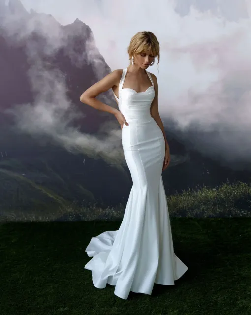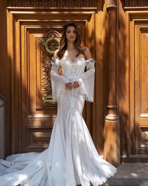 Свадебное платье приталенного силуэта имеет V-образный вырез. Юбка имеет небольшой шлейф. Съемная юбка с длинным шлейфом – дополнение образа невесты.