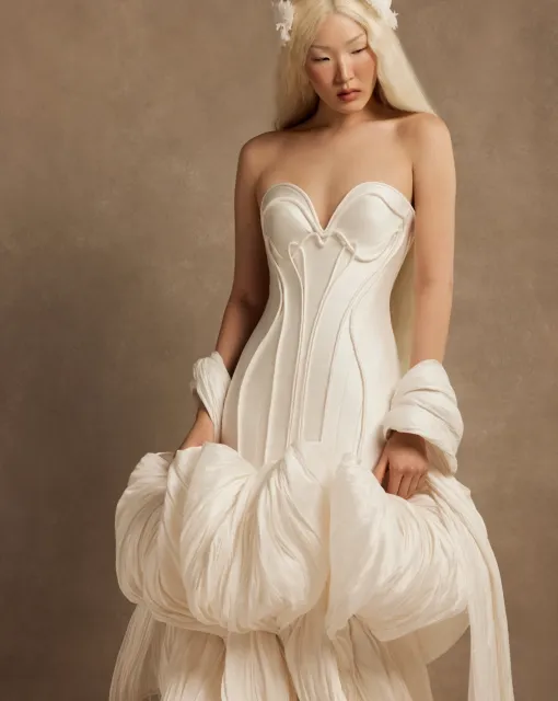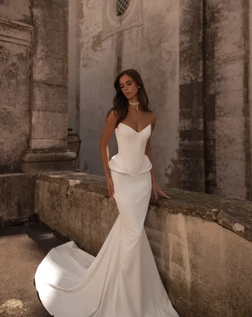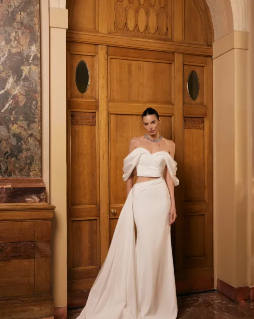 Свадебное платье приталенного силуэта. Платье выполнено из ткани, полностью расшитой бисером и пайетками. Горловина платья оформлена воротником стойкой из молочного сатина. Спина и бока полностью открыты. Линия талии подчеркнута сатиновым поясом и бантом с лентами. Приталенная юбка дополнена длинным шлейфом.