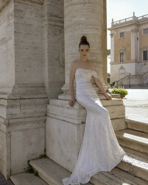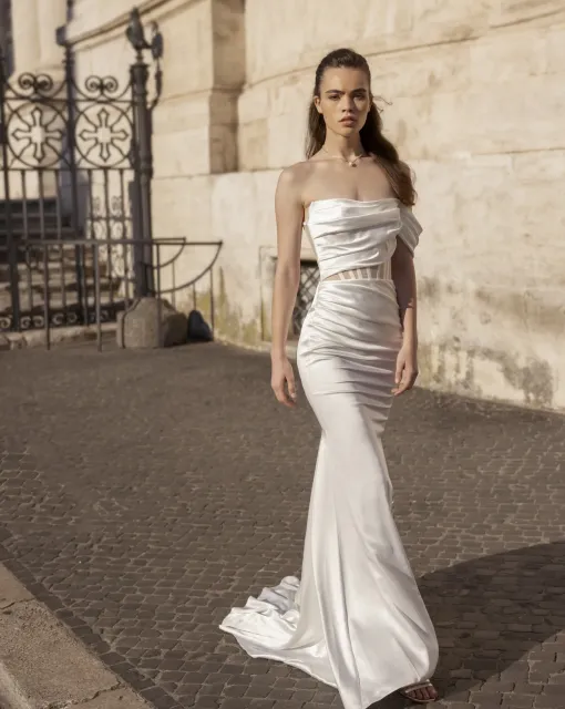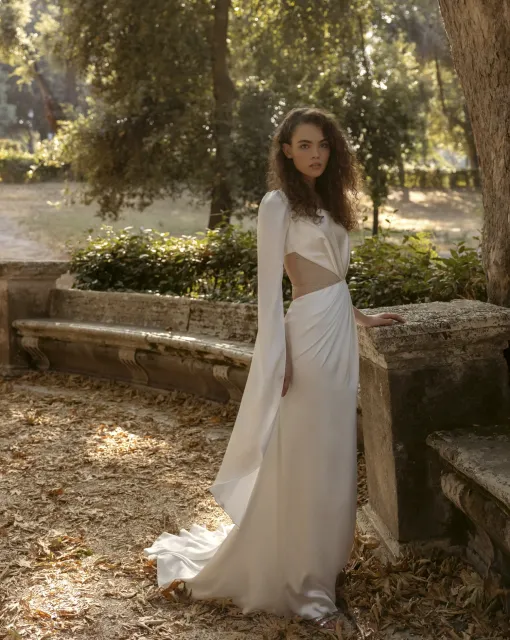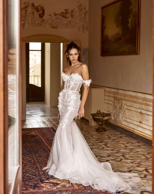 Свадебный комплект из корсета и юбки. Полупрозрачный корсет выполнен из кружевной сетки в цветочки и дополнен драпировкой из молочного воска. Нижний край корсета оформлен фигурной линией с мысом квадратной формы по переду. Низ юбки дополнен аркообразными воланами. Платье может быть дополнено накидкой с рукавом и длинным шлейфом. Рукав накидки и шлейф по низу декорирован аппликацией в виде большого цветка.