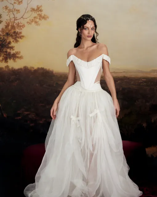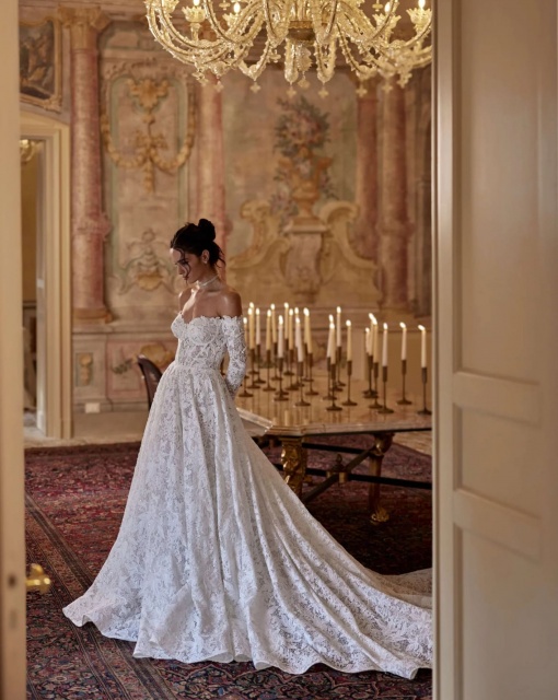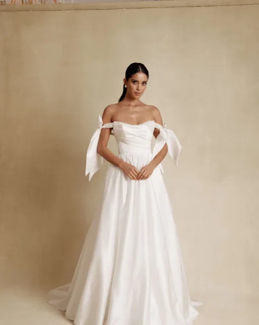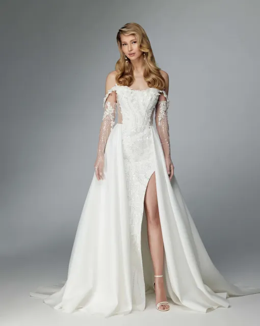 Силуэтное свадебное платье с длинным съемным шлейфом. Вырез платья выполнен в форме сердца. Многослойная юбка имеет длинный шлейф.