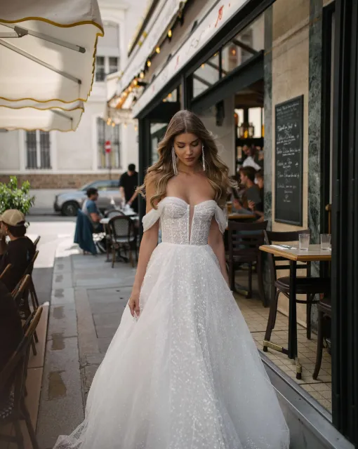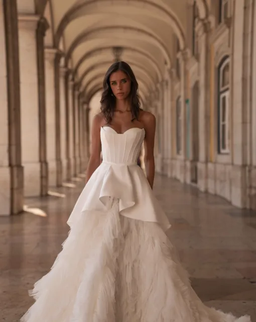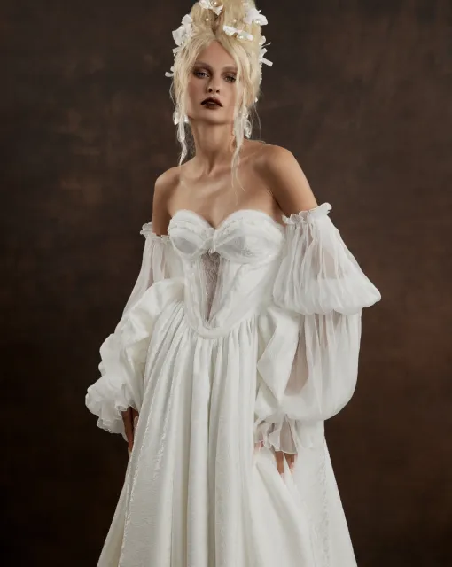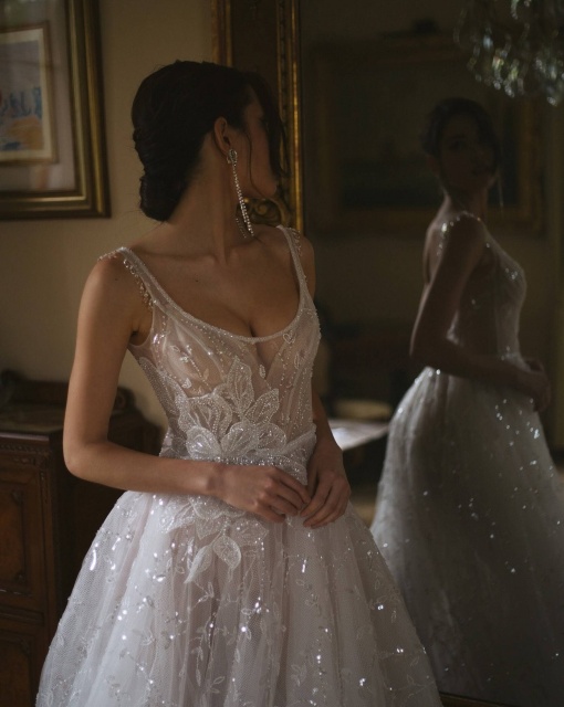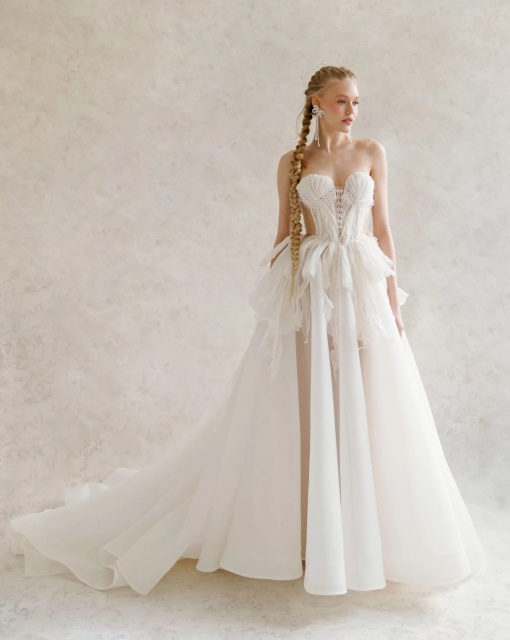Свадебное платье А-силуэта со шлейфом и разрезом на левой ноге. В свадебном образе присутствует болеро с объемными цветами, дополняющее платье. Цветы могут быть съемными. Спинка и бока платья полупрозрачные с сетчатой драпировкой.
