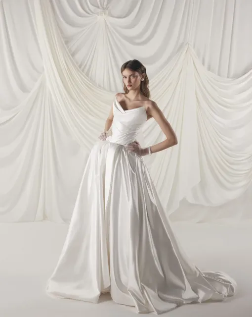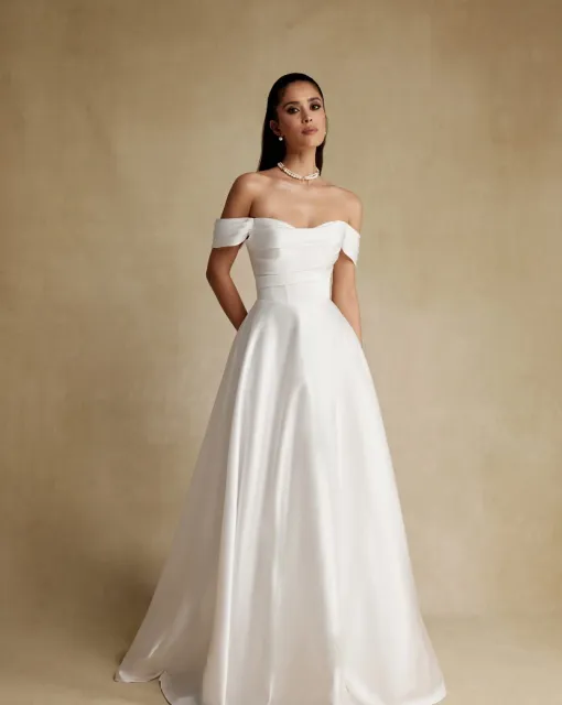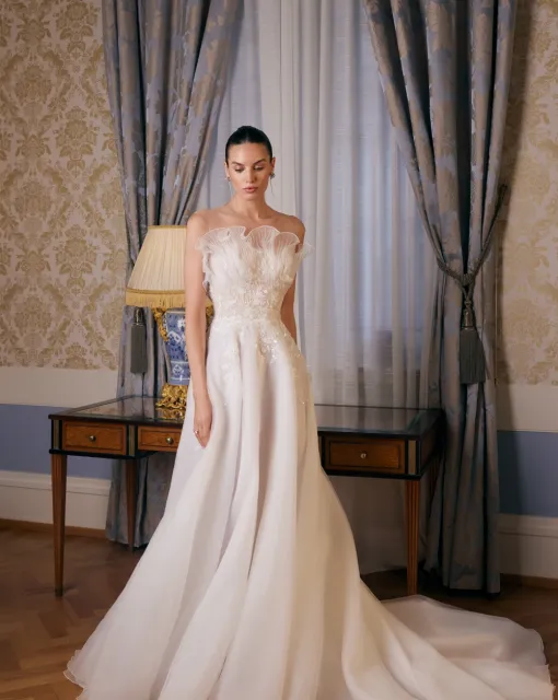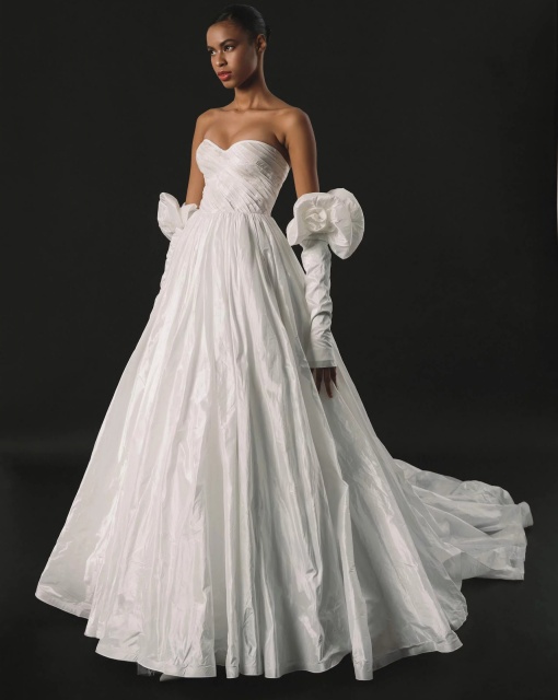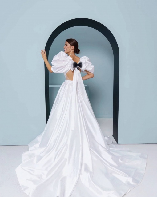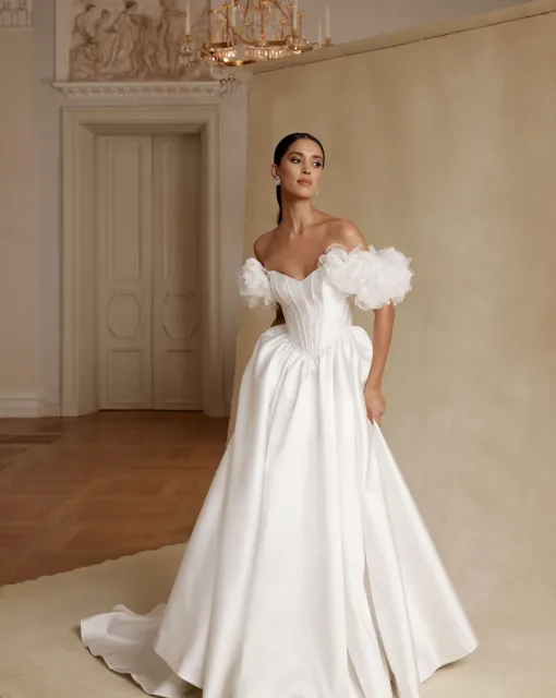 Свадебное платье А-силуэта декорированное кружевом с объемными цветами. Спереди на корсете проходит горизонтальная драпировка, которая переходит в рукава. Дополнительно лиф и драпированные рукава декорируются кружевными элементами.
