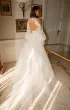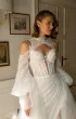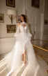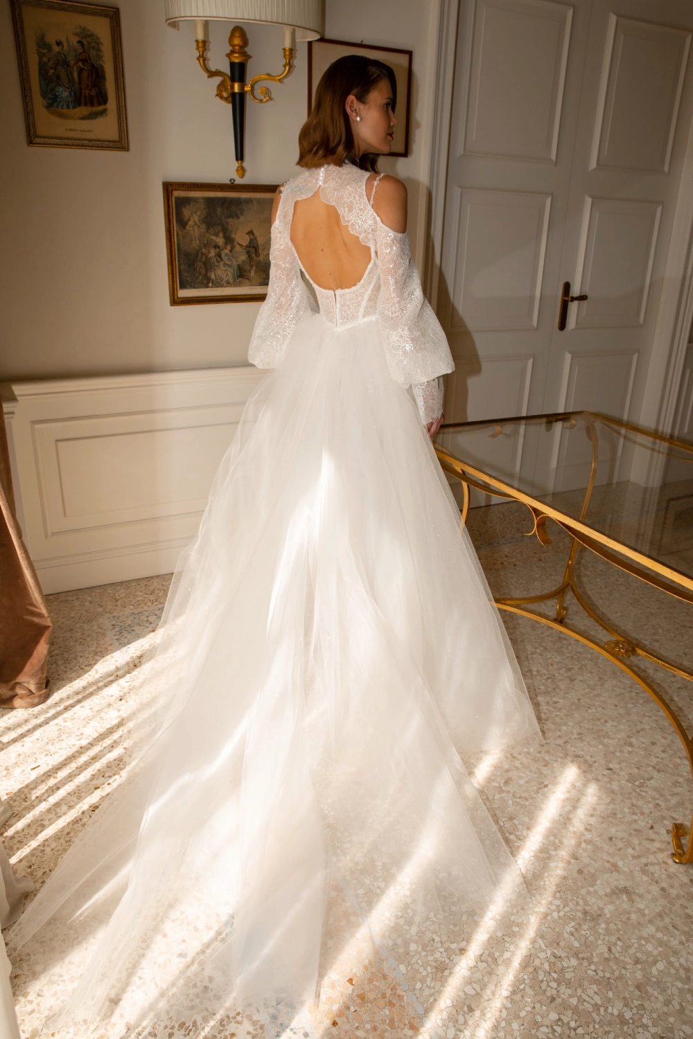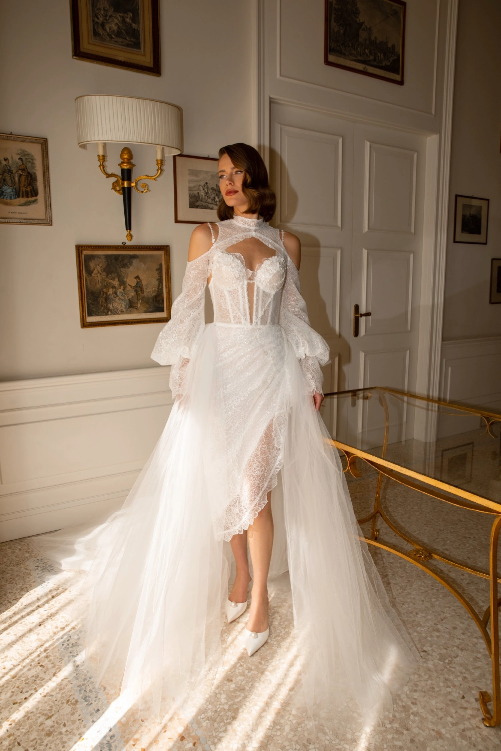 Свадебное платье силуэта «рыбка» с полупрозрачным эффектом и отрезной талией, плавно опущенной по спинке. Корсет с формованными чашками, закрытой спинкой на шнуровке, покрыт кружевом с пайетками и декорирован тесьмой и кружевными цветами. Миди-юбка с асимметричным кроем, высоким разрезом и фигурной кромкой оформлена складками, переходящими в спадающий хвост. Комплект дополнен болеро с воротником-стойкой и рукавами-фонариками, а также съёмной пышной юбкой со шлейфом и мерцающим фатином. Возможны вариации цвета, формы спинки и отделки.