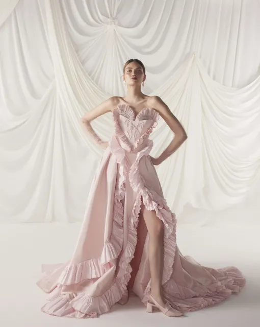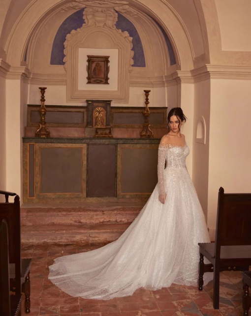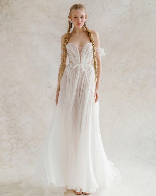 Роскошное свадебное платье с объемными рукавами и глубоким вырезом на левой ноге. Корсет платья задрапирован спереди. Юбка имеет шлейф. В коллекции Galaxy в качестве вариации есть мини-платье Ottawa.