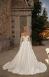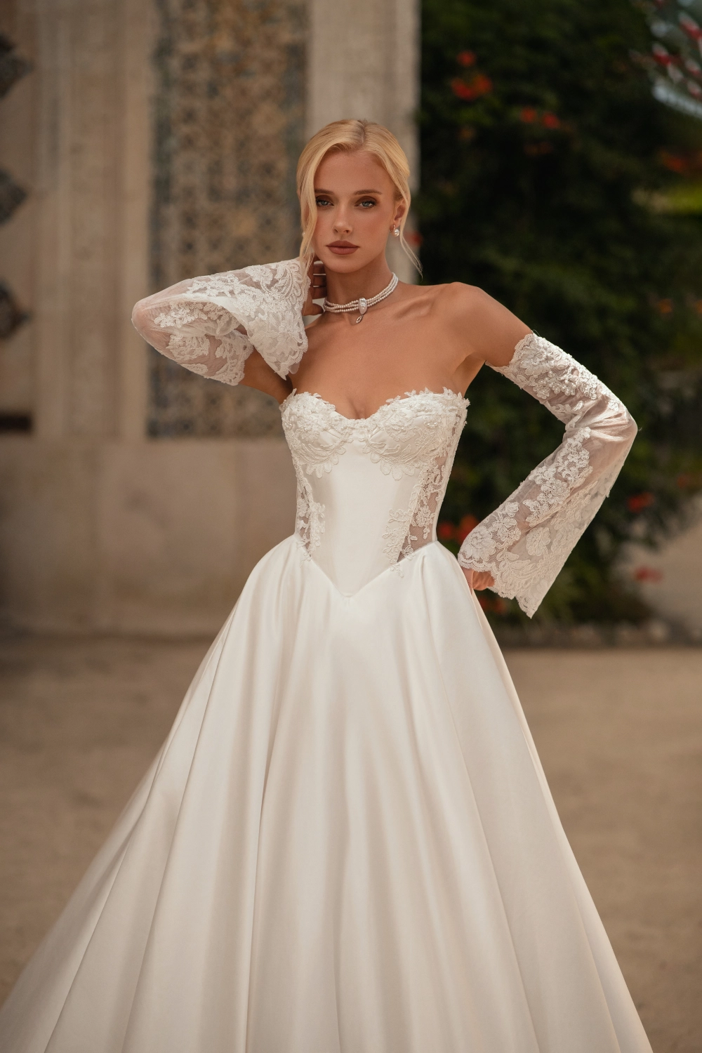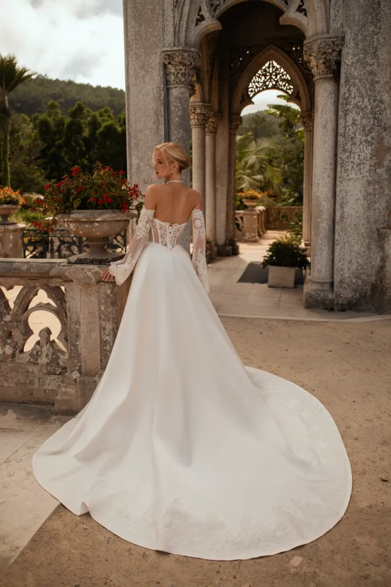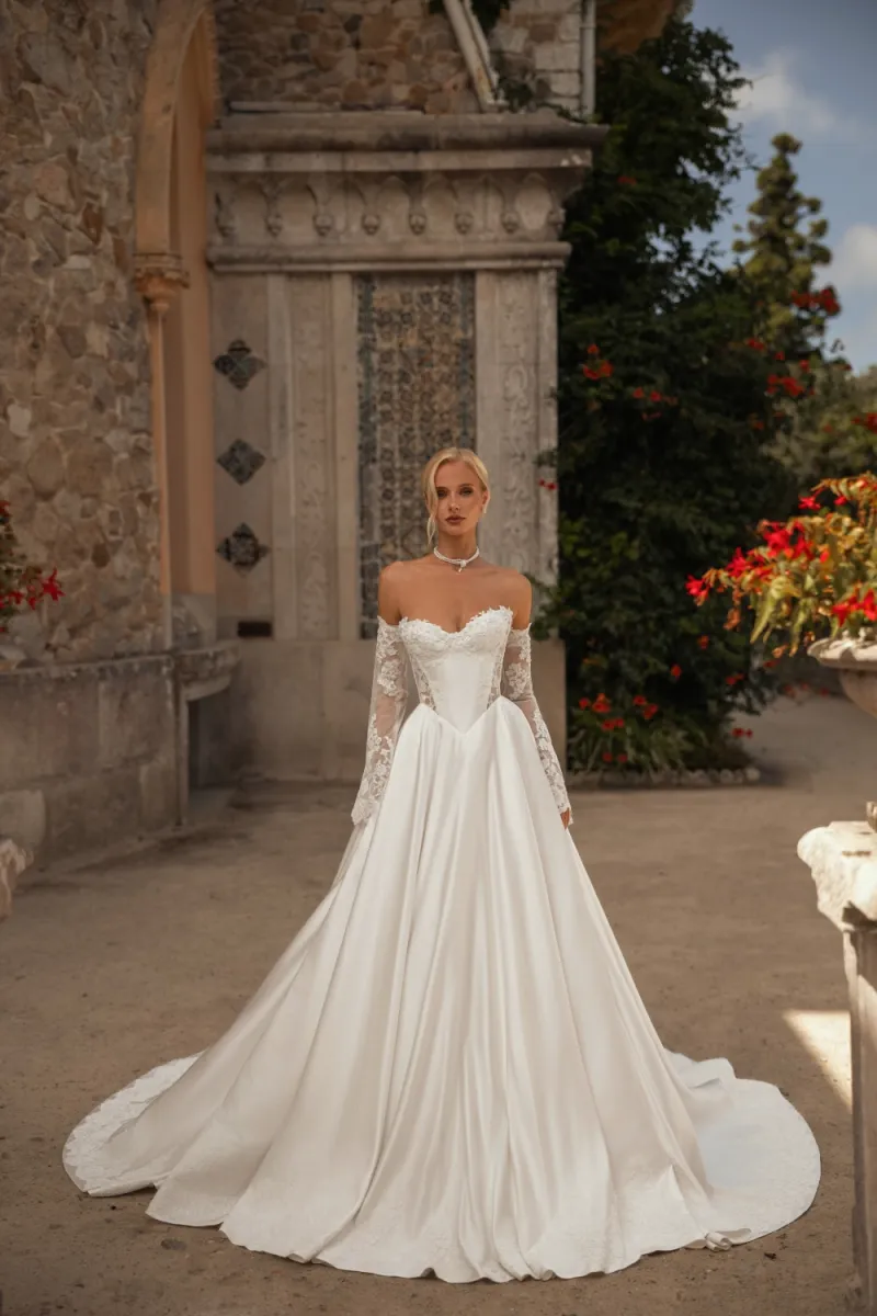 Свадебное платье силуэта «принцесса» с корсетом и пышной юбкой. Корсет с плотными чашками и открытой шнуровкой украшен кружевом с кордовой нитью и бусинами разного размера, придающими фактурность и сияние. Юбка со шлейфом выполнена из атласа, фатина и сетки, с подкладкой из искусственного шёлка. Нижний край декорирован кружевной кромкой, что добавляет изысканный акцент классическому силуэту. Образ дополняется съёмными кружевными рукавами, расшитыми бусинами, которые держатся на нежной пудровой резинке и создают романтичное настроение. Возможные изменения: внутренняя шнуровка, карманы, съёмные крылышки.
