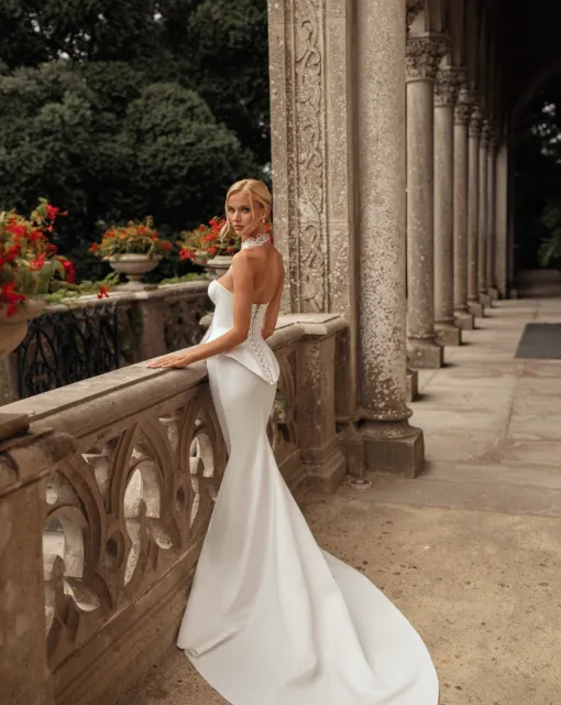 Свадебное платье приталенного силуэта с длинным шлейфом. Накидка c объемными рукавами прекрасно дополнит образ. Рукава и спинка накидки полностью покрыты розами. Длинный шлейф накидки съемный.