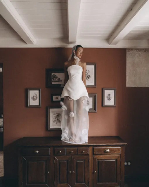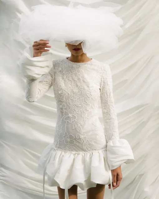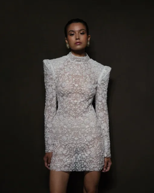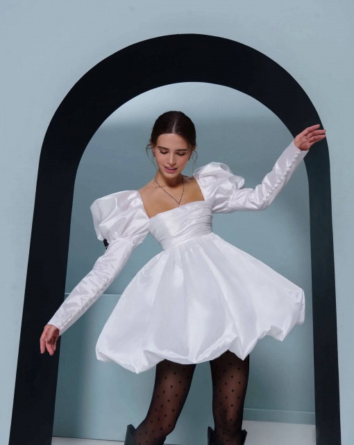 Эффектное свадебное мини-платье. Корсет и юбка густо расшиты бисером и пайетками в виде цветов. Юбка держит форму благодаря специальным технологиям дизайна.