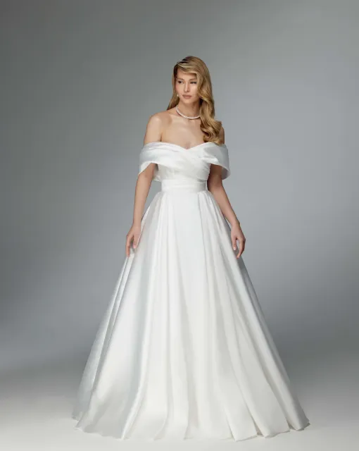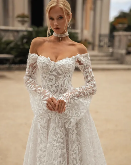 Силуэтное свадебное платье с заниженными рукавами. Юбка многослойная, с длинным шлейфом.