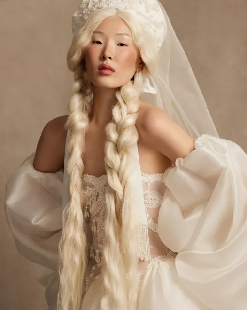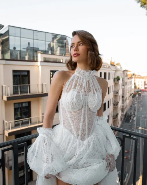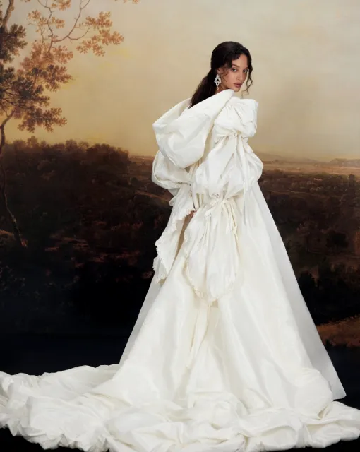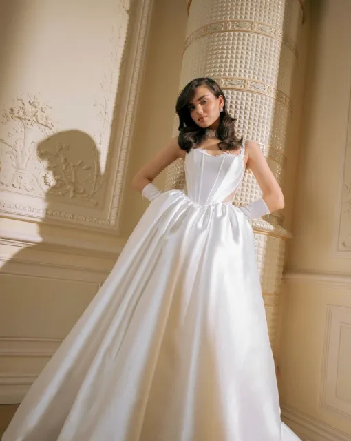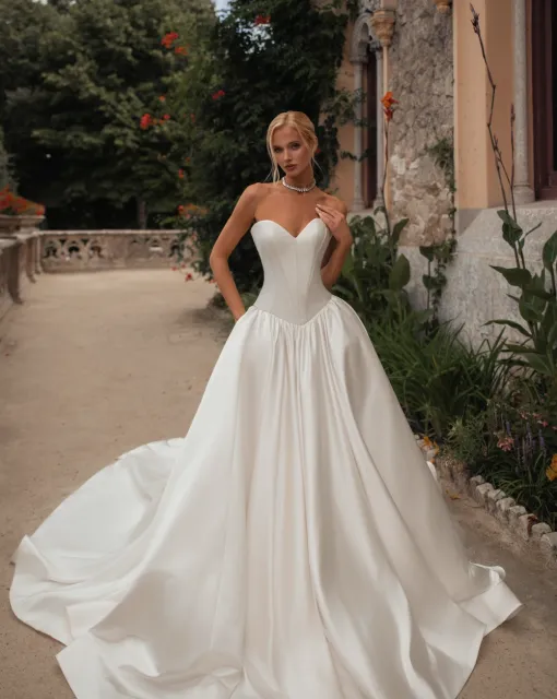 Силуэтное пышное свадебное платье с длинным шлейфом. Юбка платья украшена воланами разного уровня.