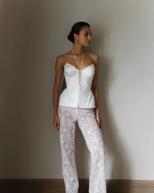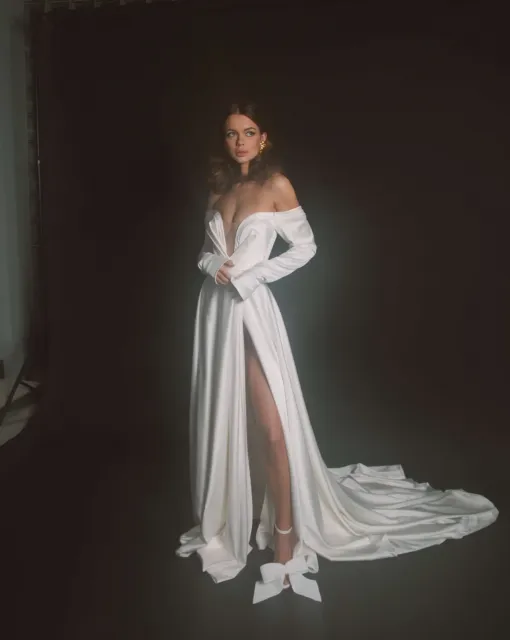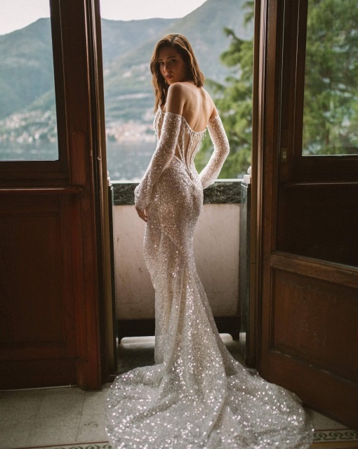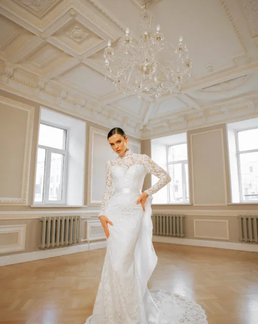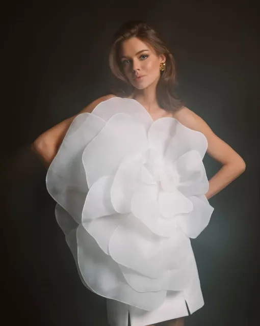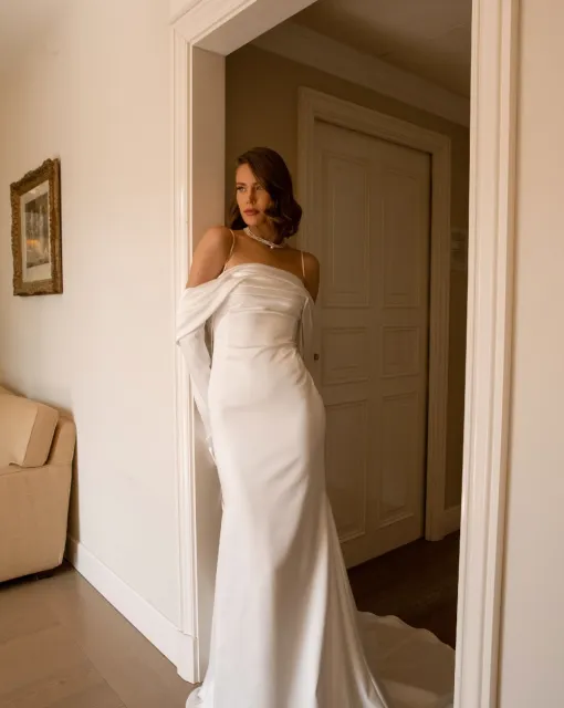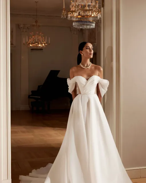 Мини-платье со съемной юбкой. Лиф асимметричный на одно плечо. Спереди декоративный бант и драпировка. Мини-юбка обернута асимметричной драпировкой. По низу юбки съемная тесьма с перьями. Платье предлагается со съемной юбкой А-силуэта в пол со шлейфом и фигурной трехслойной оборкой со складками по линии талии.