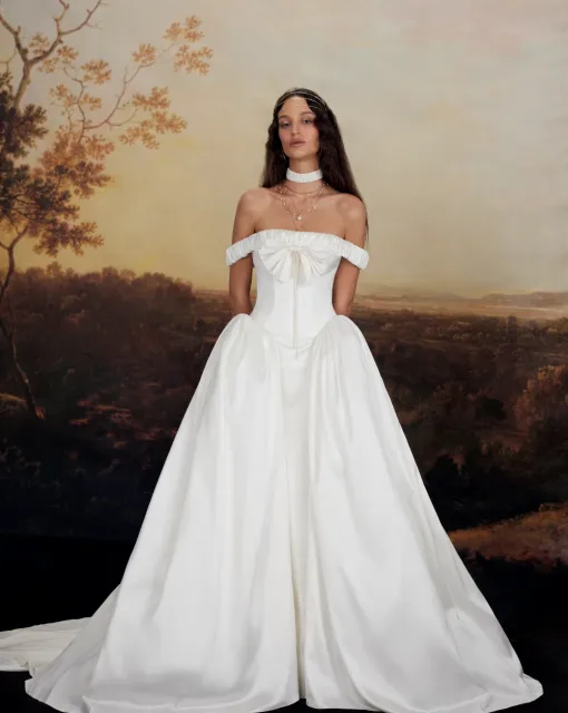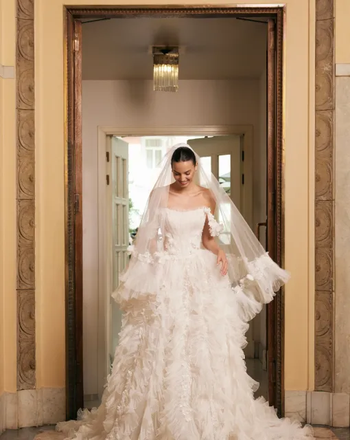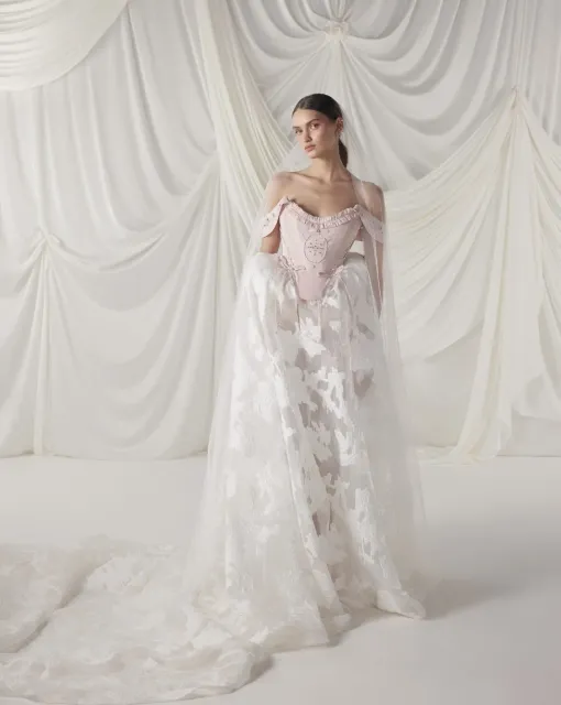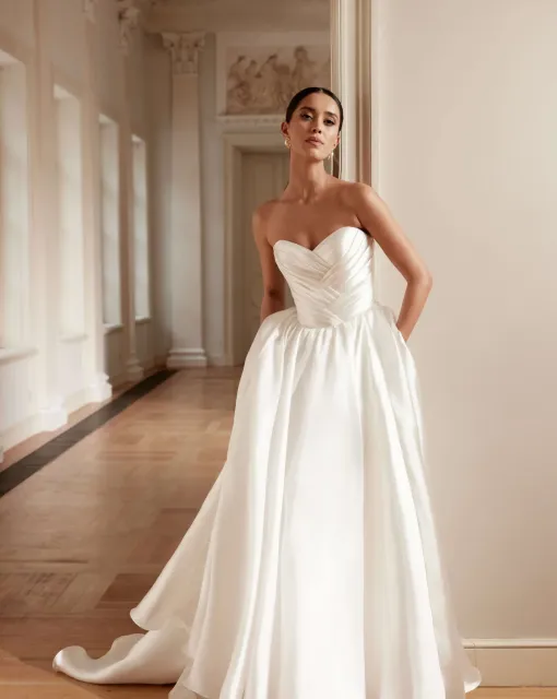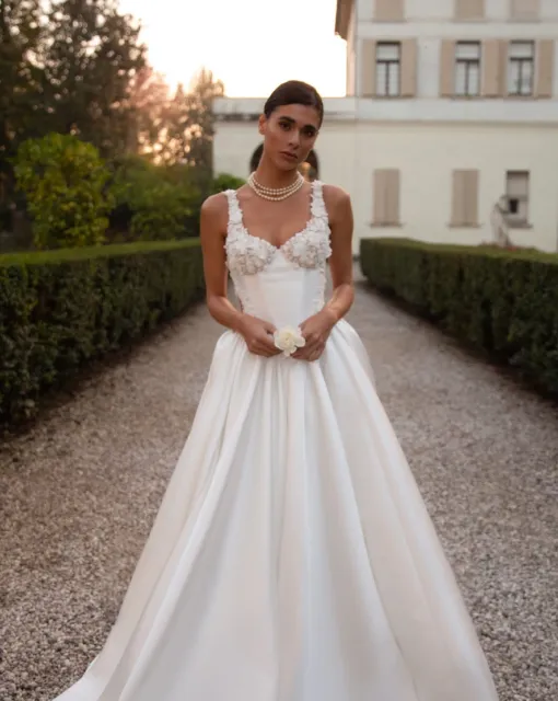 Свадебное платье А-силуэта с разрезом спереди. Корсет вручную украшен декором из веточек, расшитых бисером и пайетками. Платье имеет небольшой шлейф.