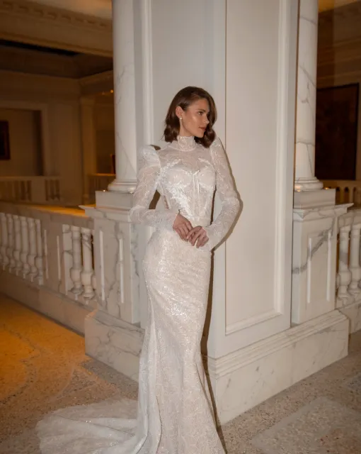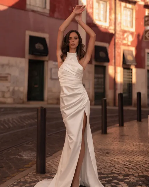 Свадебное платье-русалка со шлейфом. Платье украшено акцентными цветами разных размеров, которые дополняют низ платья. Может быть выполнено в варианте без цветов.