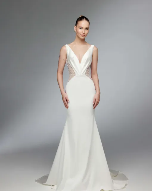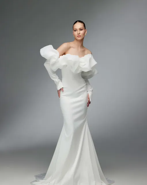 Свадебное платье силуэта «русалка», созданное для выразительного и утончённого образа. Корсет с мягким блеском атласа задрапирован по диагонали и дополнен прозрачной спинкой из корсетной сетки. Фигурная линия талии с мысом и веерообразная драпировка на спинке подчёркнуты декоративной расшитой тесьмой. Приталенная юбка с длинным шлейфом оформлена фигурным подрезом: верхняя часть с драпировкой по диагонали, нижняя — с эффектным расширением и разрезом по левой стороне. Образ завершает съёмный шарф с центральной драпировкой и длинными хвостами, украшенными кистями из бусин и бисера. Возможные изменения: исполнение юбки без разреза, непрозрачная спинка корсета.