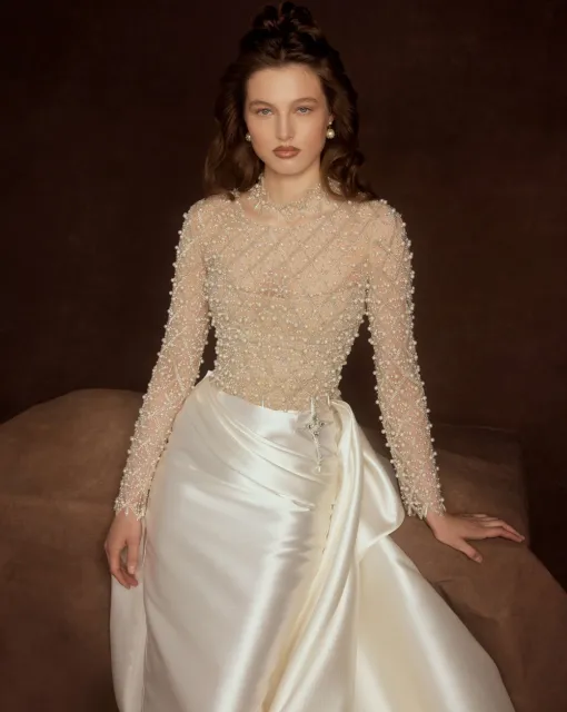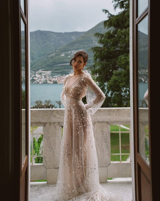 Платье А-силуэта, рельефный корсет на тонких бретелях. Верх корсета украшен V-образным вырезом. Талия подчеркнута поясом, юбка имеет небольшой шлейф и карманы по бокам.