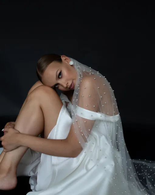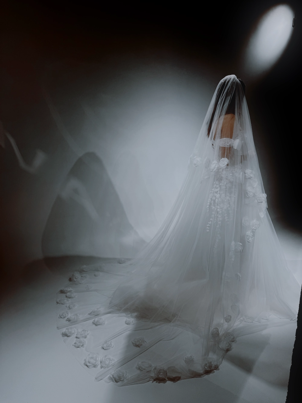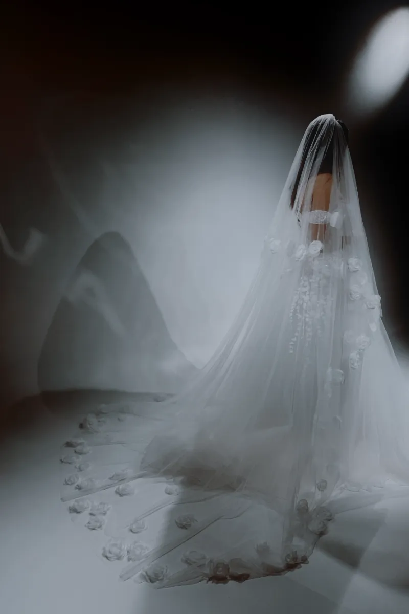 Фата со шлейфом и 3D-цветами по краю. Цветочная дорожка создаёт эффект сказочной театральности и мягкой драмы.