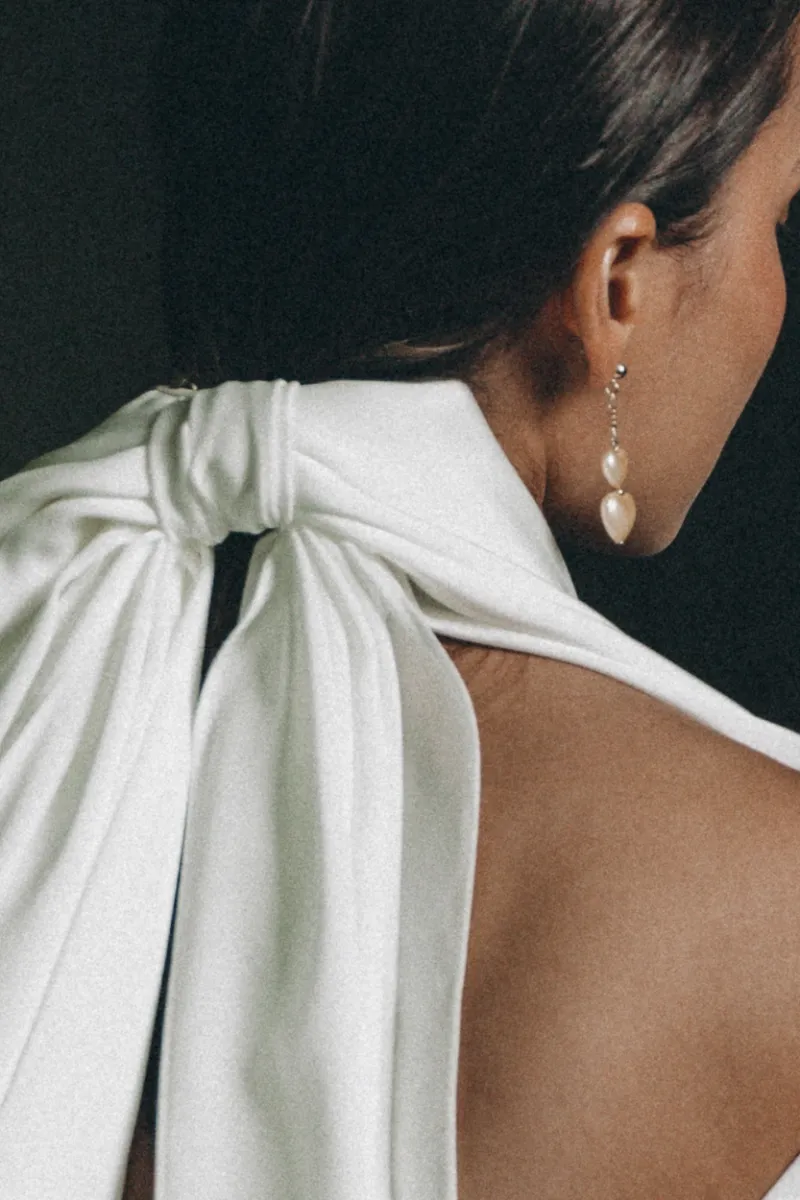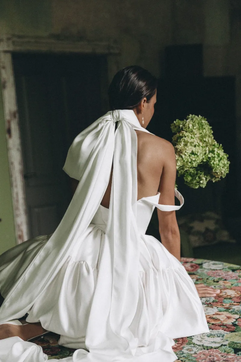 Длинный бант из шёлка Armani — современная альтернатива классической фате. Лаконичный, элегантный акцент для актуального свадебного образа.