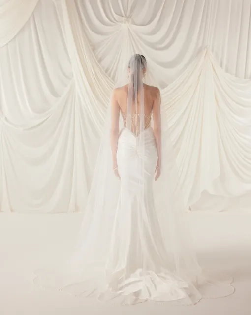 Длинная фата со шлейфом и креплением на макушке. Минималистичный цветочный декор по низу добавляет мягкую романтичность и вариативность стилизации.