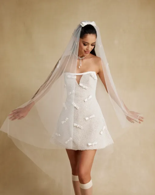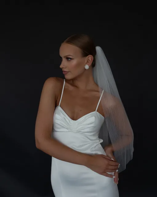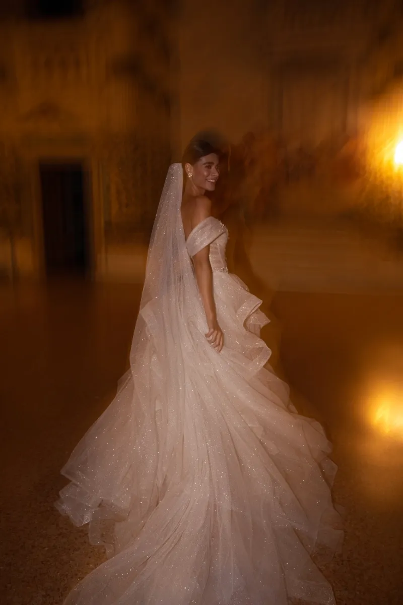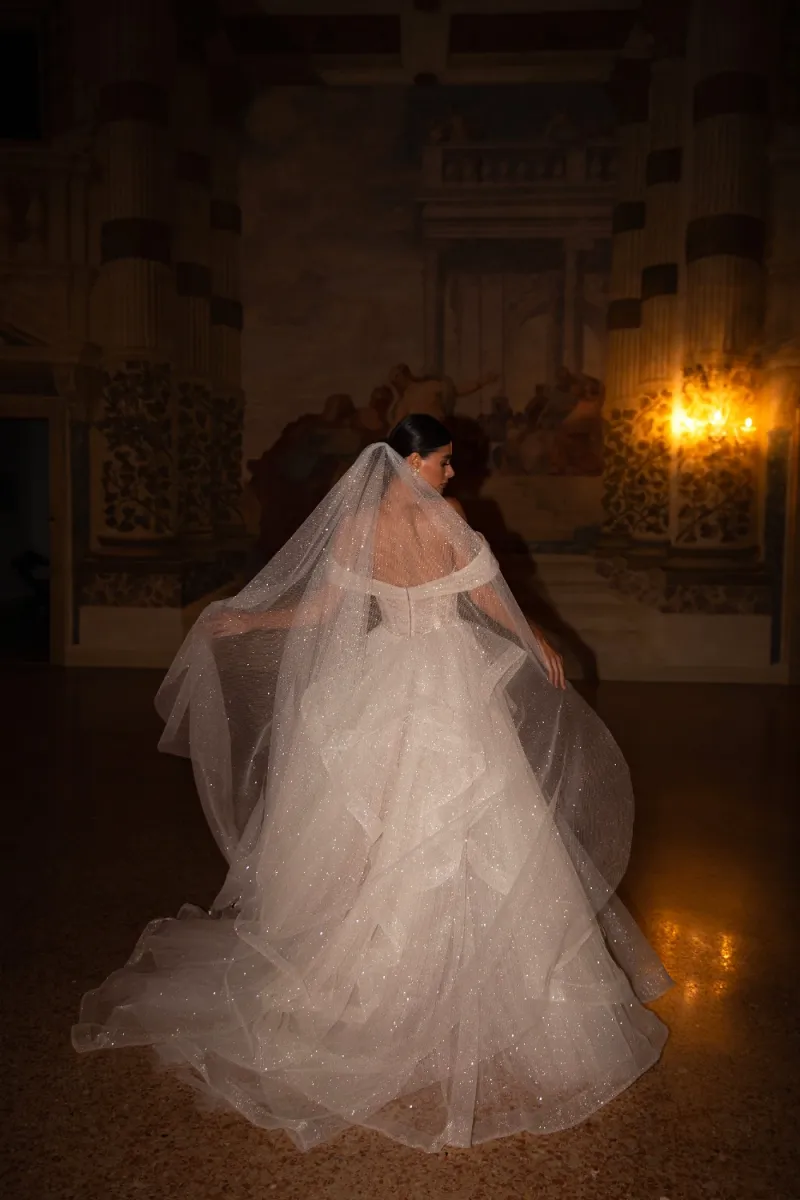 Фата из мерцающего тюля с мягким шлейфом. Мелкие блёстки создают эффект свечения и идеально подходят для вечерних свадеб.