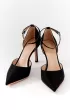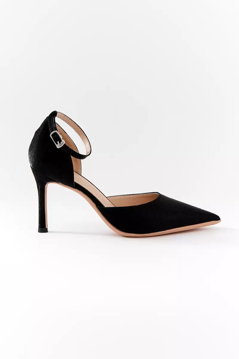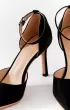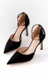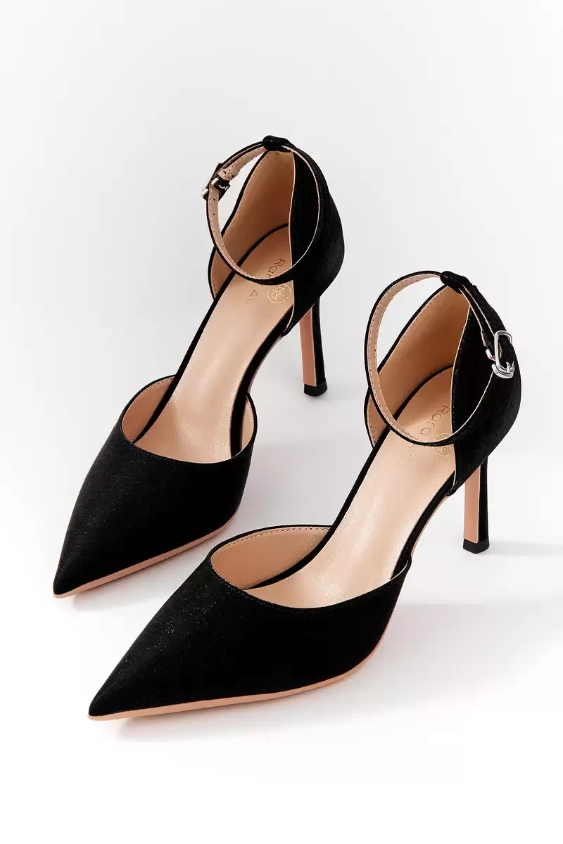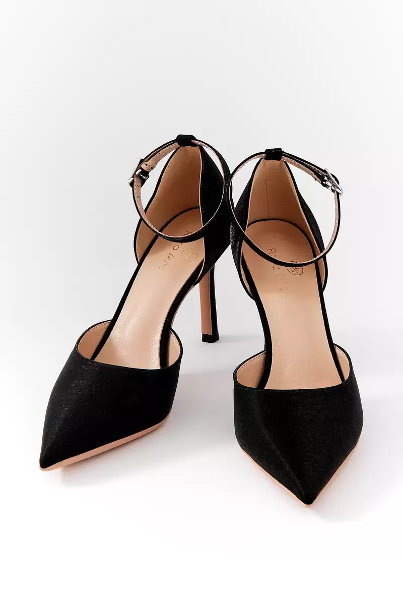 Полуоткрытые босоножки черного цвета с переливающимся на свету материалом. Тонкий ремешок вокруг лодыжки обеспечивает надежную фиксацию и подчеркивает элегантность образа.