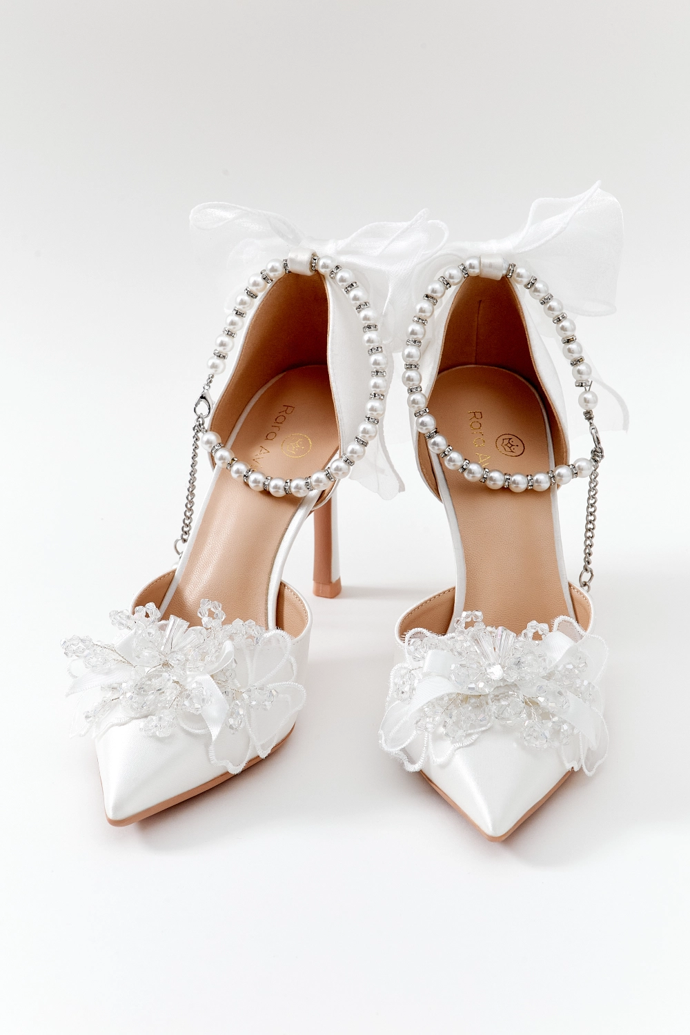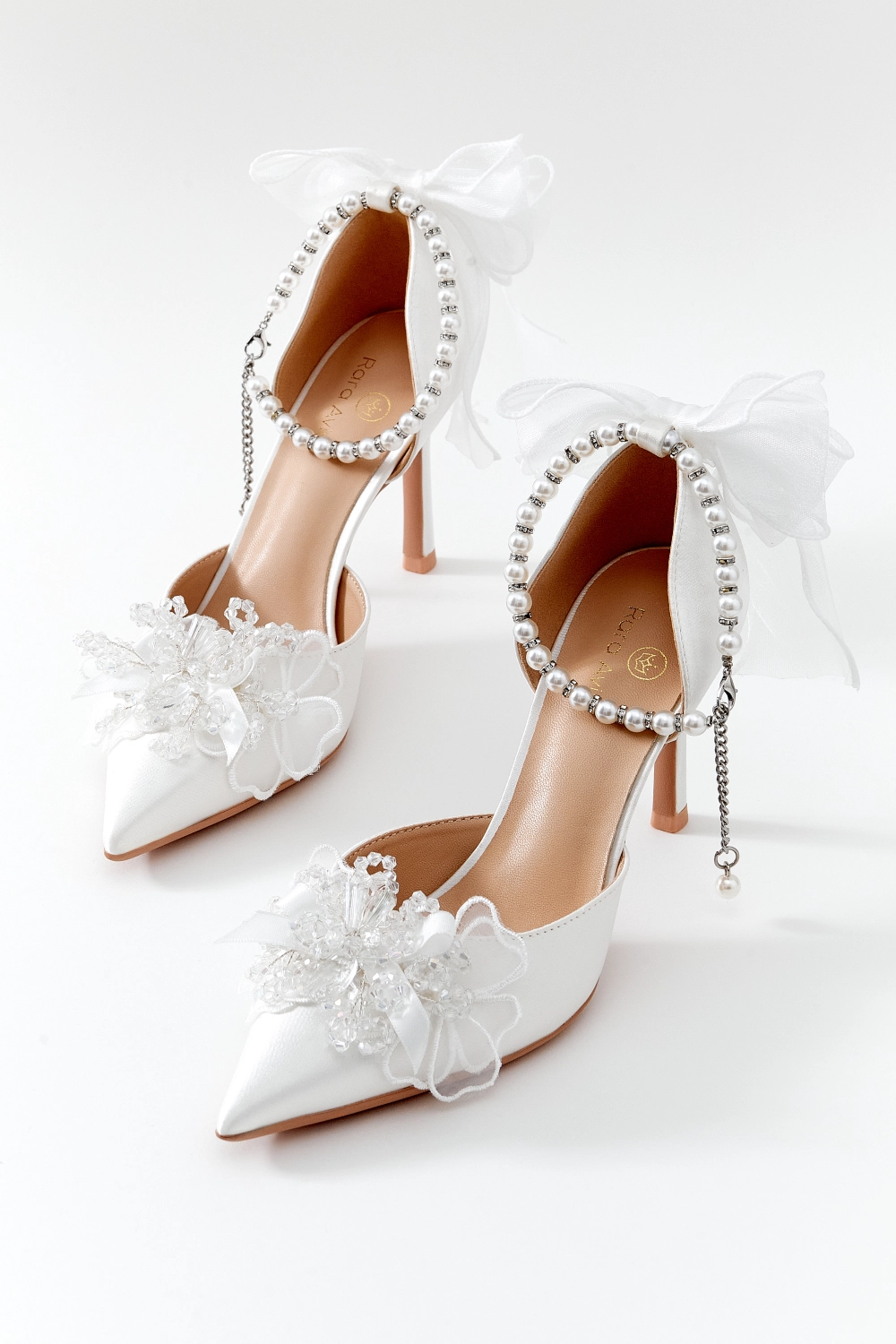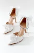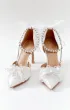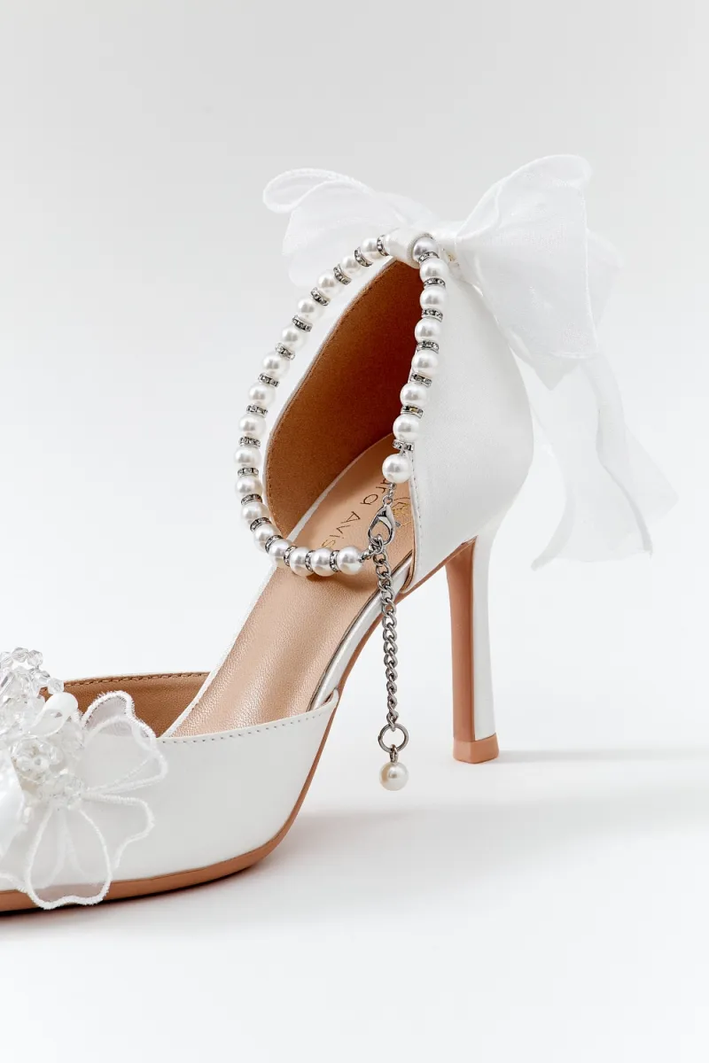 Полуоткрытые лодочки на высоком каблуке с ремешком из жемчуга и страз вокруг лодыжки. Дополнительный декор — атласный бант на пятке и кружевной цветок с бисером на носке.