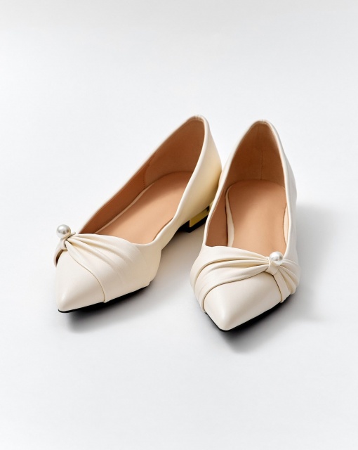 Белые лодочки с рельефным узором и объемным цветком на пятке, дополненным перьями и крупной жемчужиной — элегантное украшение образа.