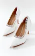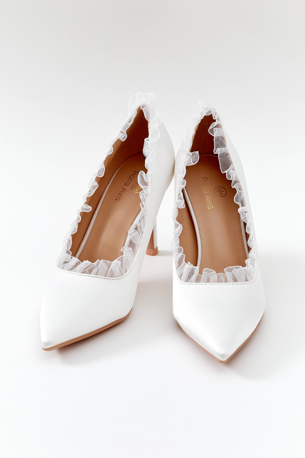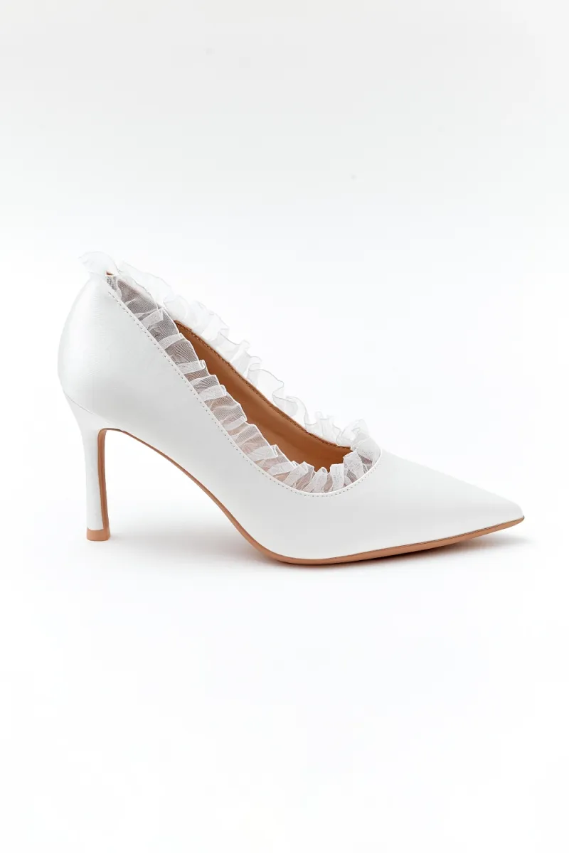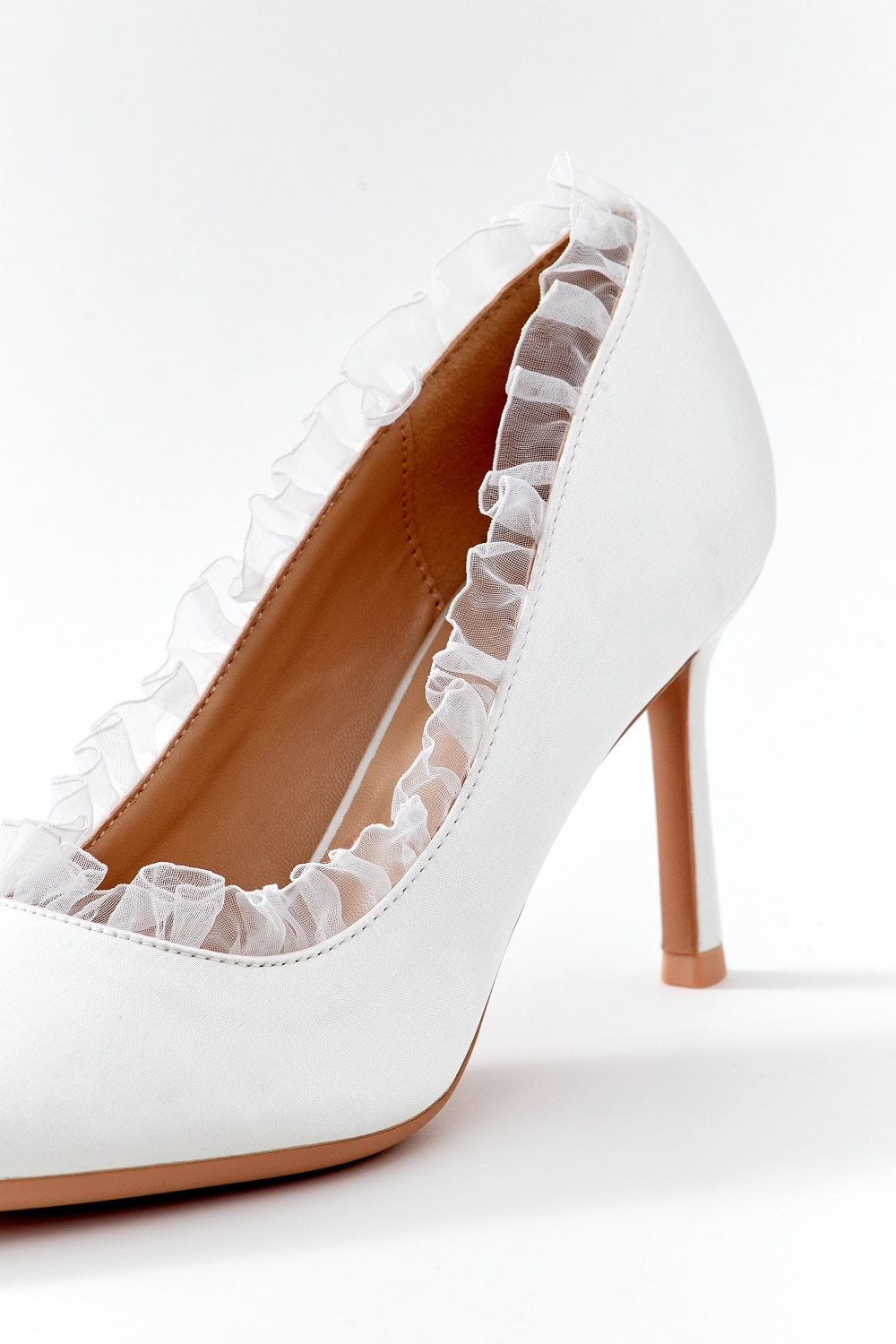 Белые лодочки на среднем каблуке с нежным декором из полупрозрачной рюши, создающей воздушный и романтичный образ.