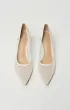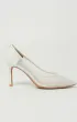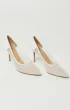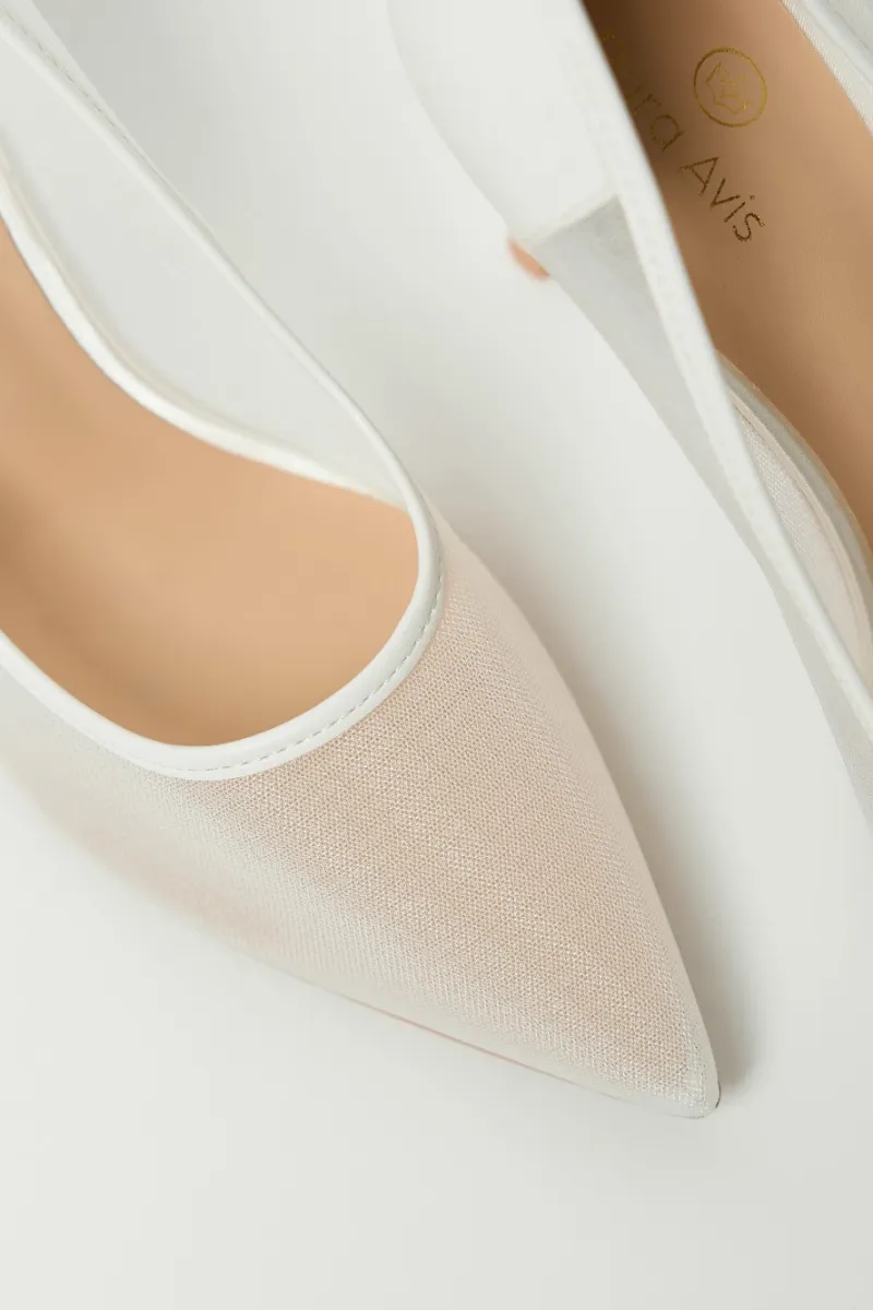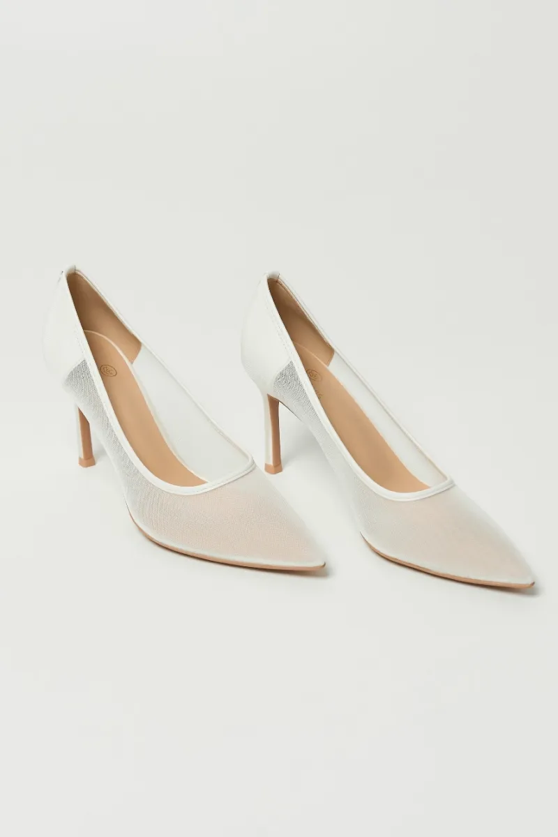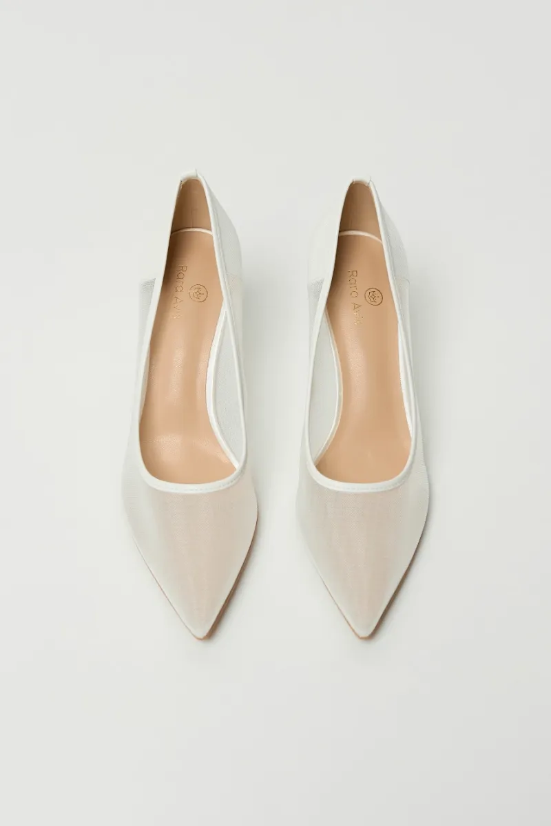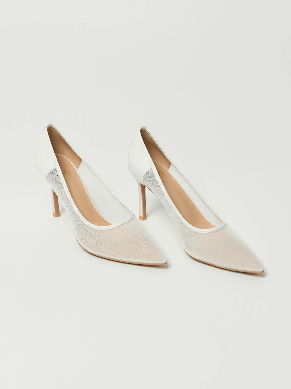 Туфли на шпильке с закрытой пяткой и острым носом. Выполнены из молочной сетки с сатиновой подкладкой, создающей мягкость и комфорт.