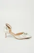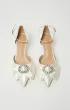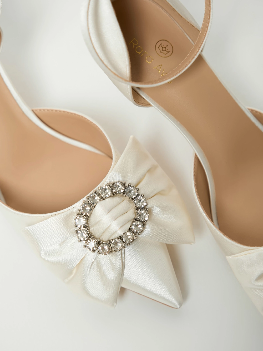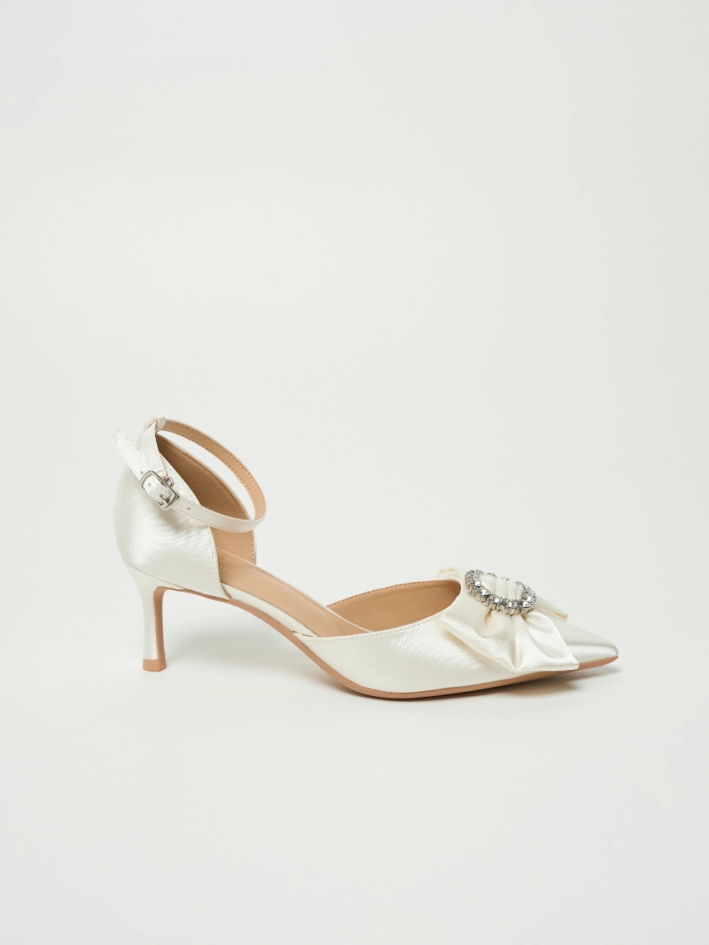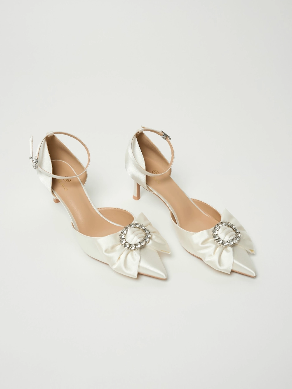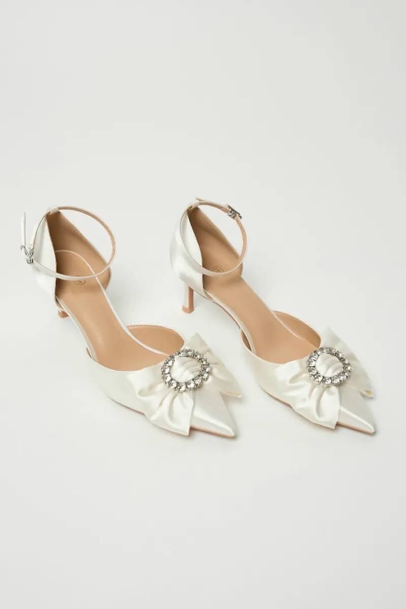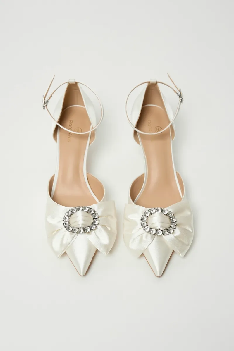 Сатиновые туфли с острым носом, изящным бантом и сияющим декором. Тонкий ремешок на щиколотке добавляет завершённости образу.