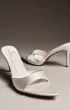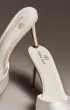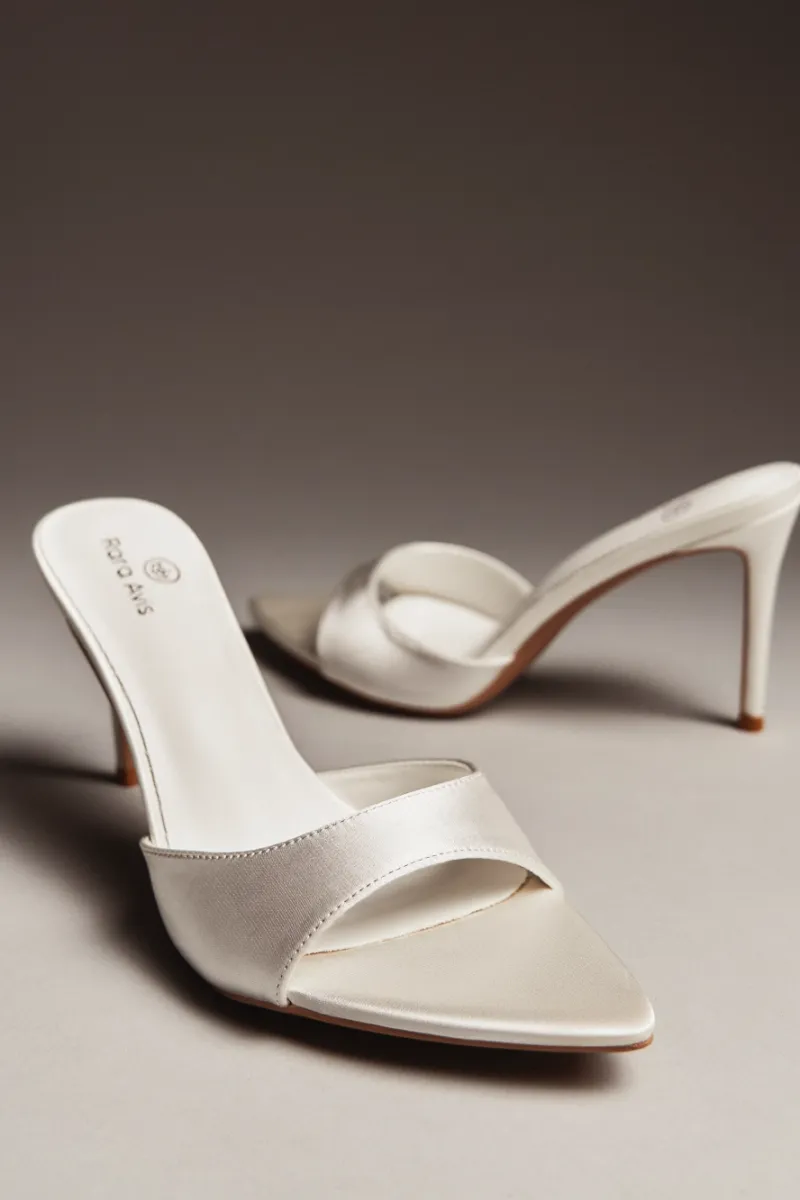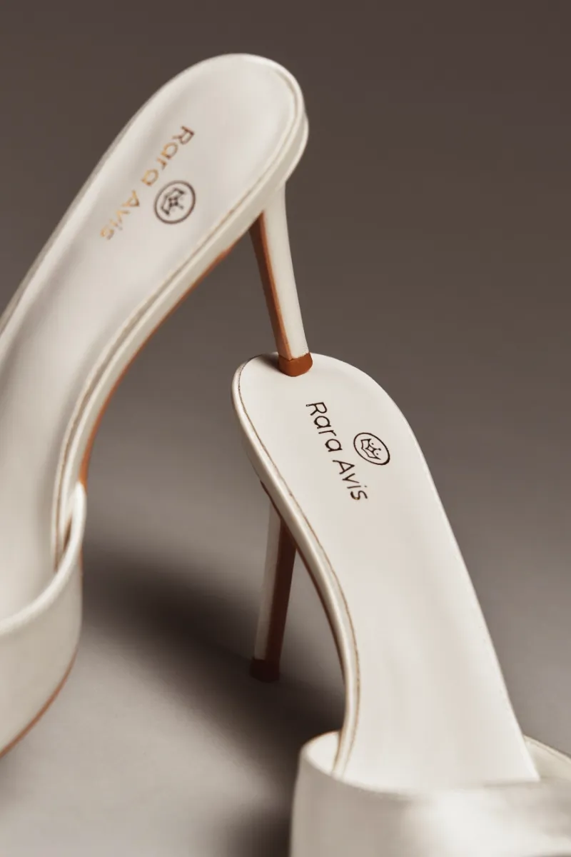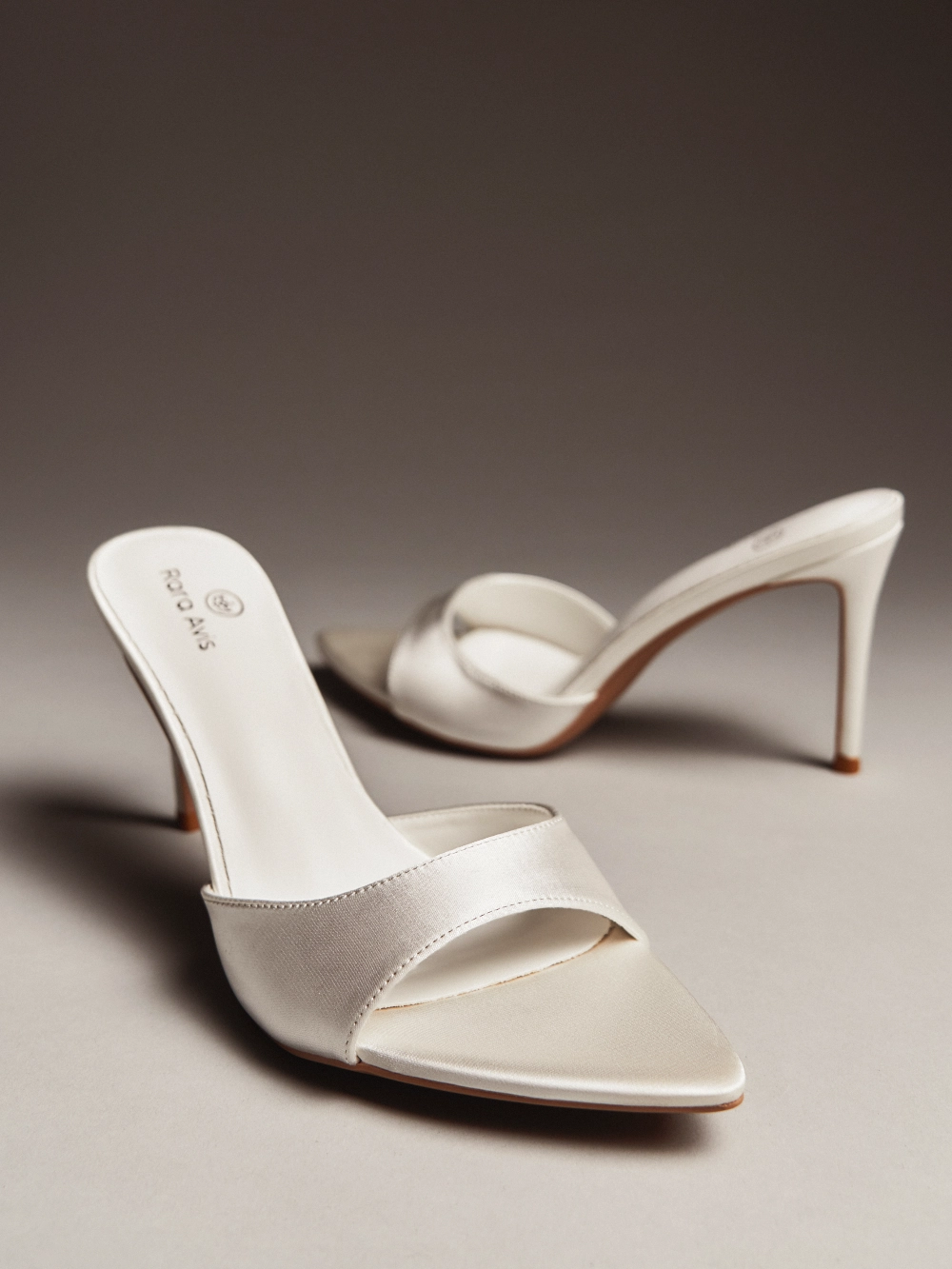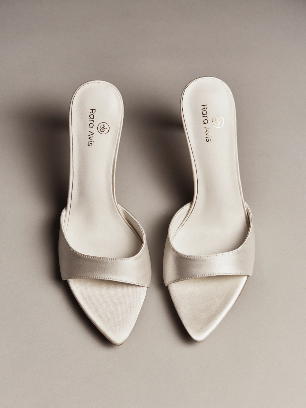 Молочные сатиновые мюли с открытым мысом и вытянутым острым силуэтом. Тонкая шпилька подчёркивает изящество формы и добавляет образу лёгкости и элегантности.