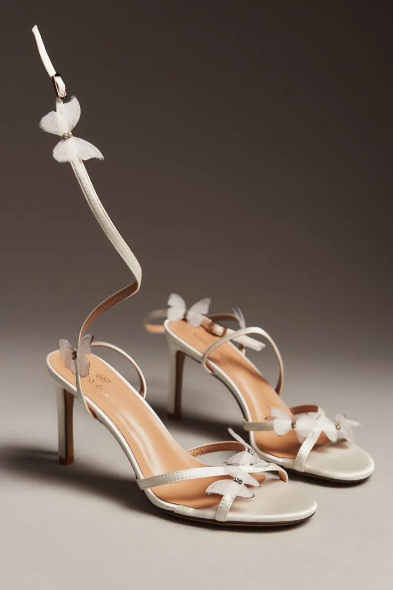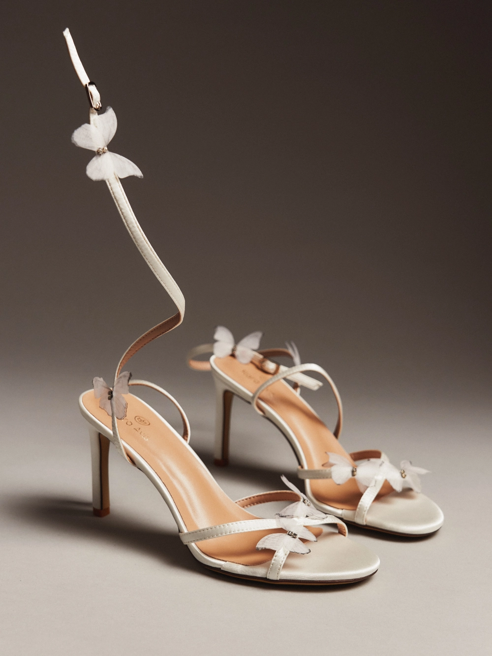 Молочные босоножки на тонкой шпильке с аккуратными ремешками и нежным цветочным оформлением. Открытая форма и лёгкий дизайн придают образу воздушность и романтичное настроение.